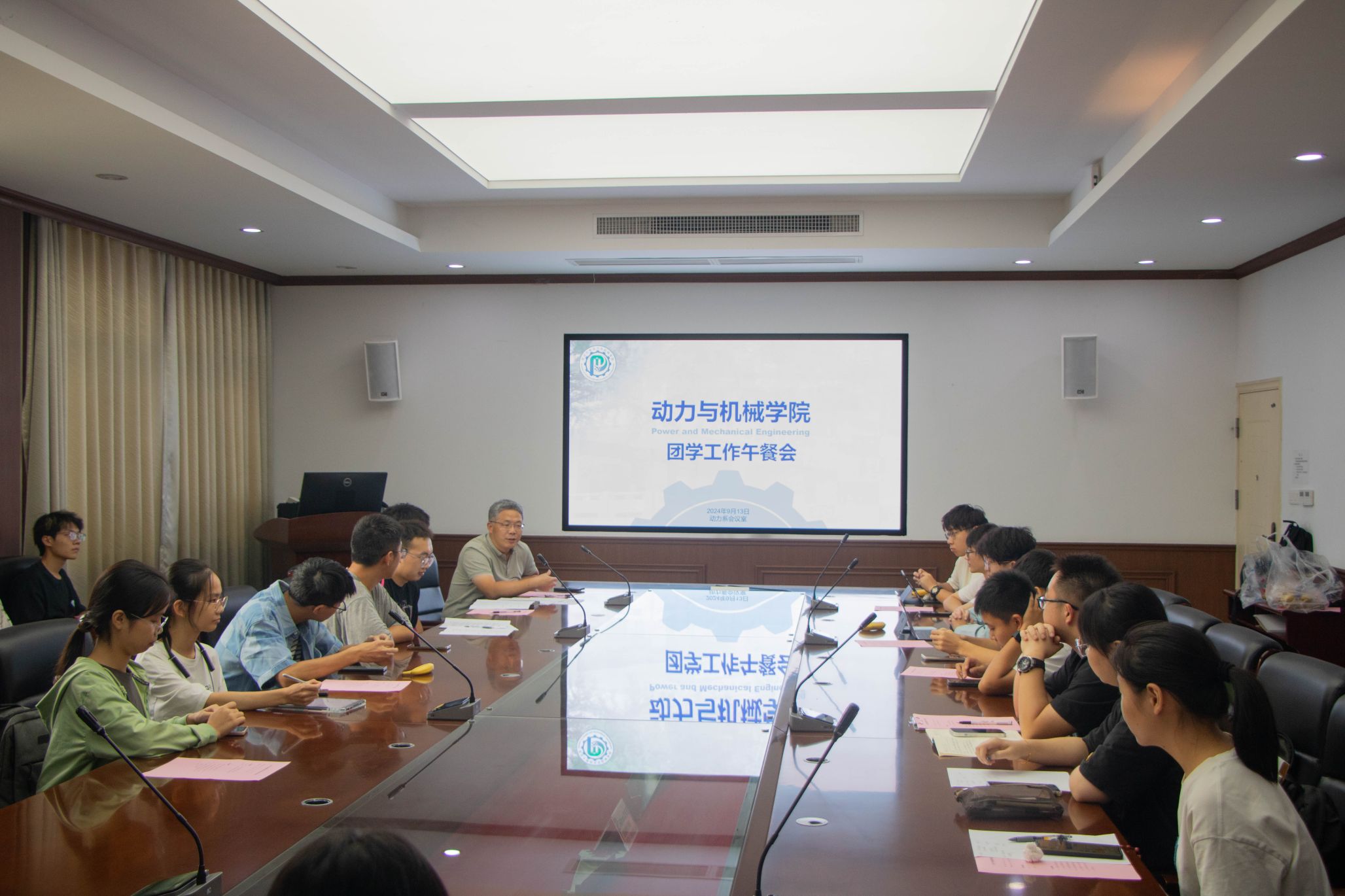 (文字记者:张宇彤 图片记者:卢宏涛)新学期伊始,为更好地规划和部署本学期团学组织的各项工作,9月13日中午,动力与机械学院在学院B9413会议室举办了以新学期团学组织工作安排交流为主题的午餐会。本次会议由学院本科生辅导员陈力瑞主持,学院党委副书记匡松,院分团委、院学生会、院青年志愿者协会、院社团指导中心以及院心理卫生协会的众多骨干成员参与,齐聚一堂,共同商讨新学期的工作计划。