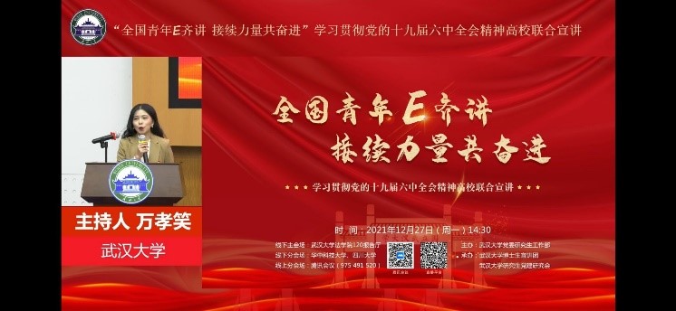 本次线上联合宣讲活动由武汉大学党委研究生工作部主办,武汉大学博士生宣讲团和武汉大学研究生党建研究会承办。本次学习会由全国博士宣讲团领衔,共分为上、中、下三篇,上篇由王天博士等围绕“以史为鉴,勿忘苦难辉煌”主题进行了宣讲,重点阐述了中国共产党的百年奋斗征程,强调深入学习贯彻党的十九届六中全会精神就要以史鉴今,永远保持同人民群众的血肉联系;中篇由安妮博士等围绕“锐意进取,无愧使命担当”主题进行了宣讲,强调历史决议是党对百年伟大成就和基本经验的高度凝练,要深刻理解“两个确立”的决定性意义。下篇由毛明凤等人围绕“自信自强,不负伟大梦想”主题进行了宣讲,强调我们要在自信自强、守正创新中创造新时代伟大成就。
