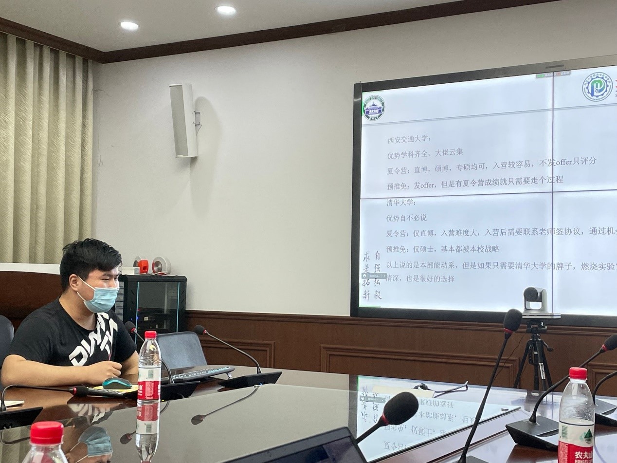 紧接着,来自武汉大学能化专业的汤宇迪学长开始分享他考研经历与对同学们的建议。首先他强调考研的压力日渐增长,大家要看清考研趋势并明确目标。其次,在决定考研后还需要正确的时间规划,对此汤宇迪学长建议道,要找准自己的优势,结合实际情况合理分配复习时间并在复习时做到心无杂念。此外,汤宇迪学长向同学们分享,在考研的准备中搜集资料同样重要,可以利用好互联网,找到对应的考研互助群等向学长学姐了解考研重点,多问多搜集多听。他告诉同学们在考研中心态很重要,要沉着冷静,最大限度发挥自己的实力;要相信自己。最后汤宇迪学长祝愿同学们取得好成绩。