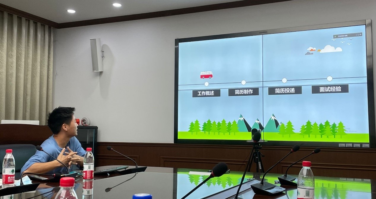 在对于找工作方面,武汉大学毕业的唐小锋、向斌学长向我们具体介绍了就业的规划。他们结合自身经历向同学们建议在不确定是否能够保研的情况下,可以选择以找工作作为保障。在找工作的准备方面,学长向大家简单分析了企业秋招与春招的区别,秋招的条件与难度相对于春招较为简单。对于就业规划学长介绍了就业的形式,并对于找工作流程进行了简单分享:工作概述、简历制作、简历投递和面试经验四个方面。简历方面学长提到推荐了APP来辅助同学完成个人简历的撰写。