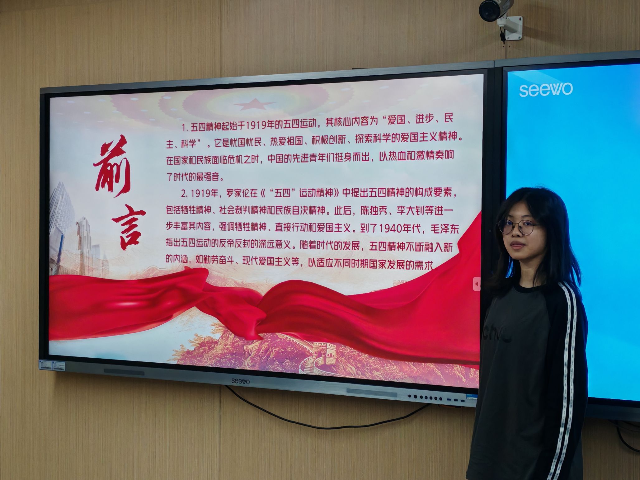 在此次活动中,陈泓冰首先带领团员青年们重温入团誓词、齐唱团歌,以此来作为传承五四精神学习的开端,振奋了团员青年们的精神。紧接着陈泓冰从五四精神的起源、核心内涵及新时代传承三个模块进行了深入讲解。其中陈泓冰重点介绍了五四精神的核心要素,即 “爱国、进步、民主、科学”,强调五四精神是忧国忧民、热爱祖国、积极创新、探索科学的爱国主义精神,是中国青年在国家和民族面临危机时挺身而出的无畏担当。1919年,罗家伦在《“五四” 运动精神》中提出五四精神的构成要素,包括牺牲精神、社会裁判精神和民族自决精神。此后,陈独秀、李大钊等进一步丰富其内容,强调牺牲精神、直接行动和爱国主义。到了1940年代,毛泽东指出五四运动的反帝反封的深远意义。随着时代的发展,五四精神不断融入新的内涵,如勤劳奋斗、现代爱国主义等,以适应不同时期国家发展的需求。