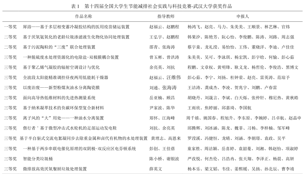作为落实国家“节能减排全民行动计划”的重要举措,本届竞赛以“节能减排、绿色能源”为主题,共吸引了来自全国31个省市自治区的514所高校参赛,作品参赛5201件,创造了自2008年创办以来参赛学生数量、参赛作品数量、参赛高校数量三项数据的历史新高。我校积极备赛,先后在全校范围内组织动员、初赛选拔、参赛培训和校内决赛,评选出15项作品参加全国评选,全部获得国奖,如表1所示。