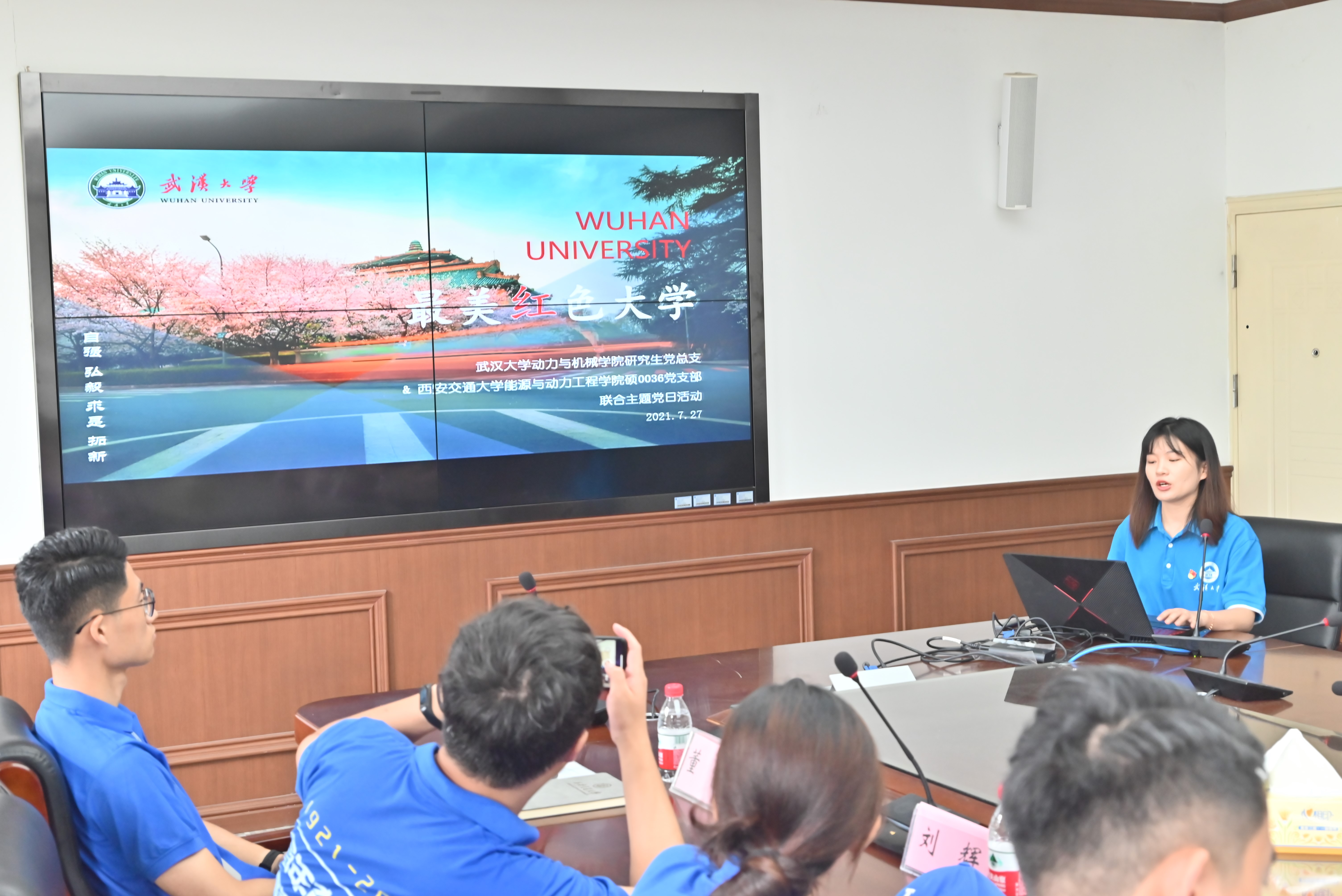 首先由我院动力系研究生第四党支部唐巾洁介绍“最美红色大学”——武汉大学,通过讲解武汉大学的红色历史传承、抗疫小故事,介绍我校我院的历史变迁与专业革新,向西安交通大学的老师和同学们生动展示了学校、学院风采风貌,弘扬了同心抗疫的武大精神。