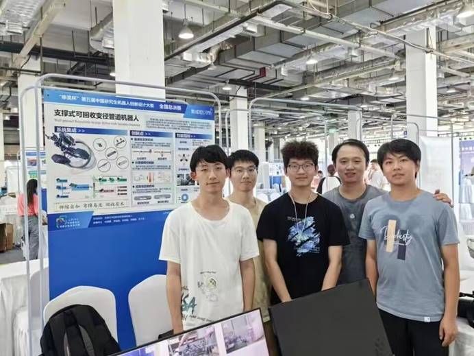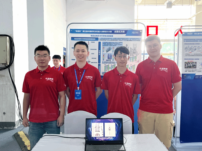 我校一等奖获奖队伍“Re0-Robot队”由动力与机械学院的叶谋景、罗国相、李帅刚、李嘉鹏、李子辰5位研究生组成,肖晓晖和冯朝老师为指导教师。队伍设计了一种支撑履带式管道机器人,由行走模块、摄像头模块、机械臂模块组成,适应性高,能够实现主动及被动适应不同管道。通过模糊转向和姿态控制,可以实现机器人自主运动。