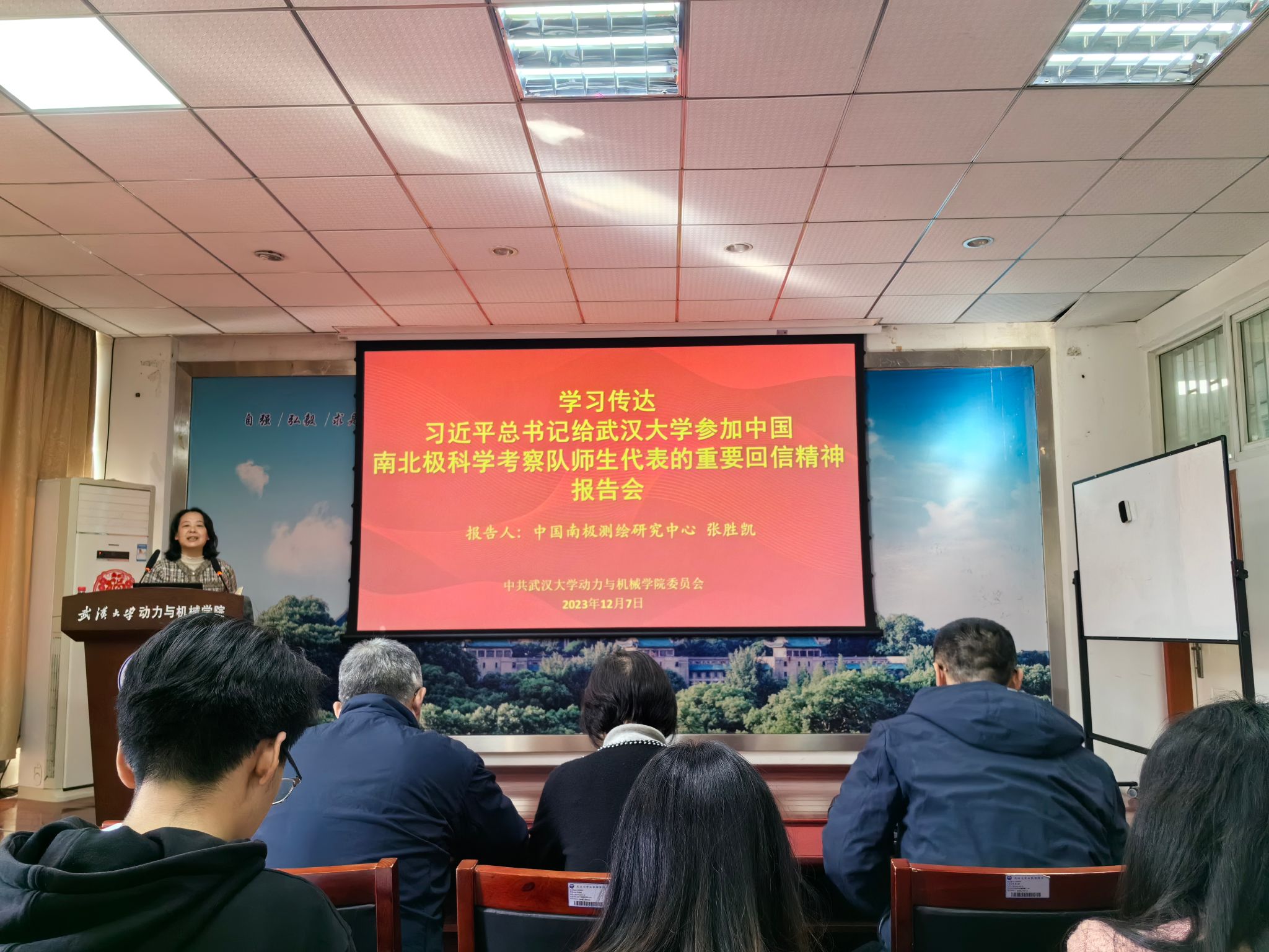 12月7日下午,学院在九教报告厅举行学习传达习近平总书记给武汉大学参加中国南北极科学考察队师生代表的重要回信精神报告会,武汉大学中国南极测绘研究中心张胜凯副教授为全院干部师生代表作《让五星红旗在南极上空高高飘扬》的专题报告。学院党委中心组全体成员、教师党员代表和本研总支及支部全体党员干部参加报告会,党委书记孙萍主持报告会。