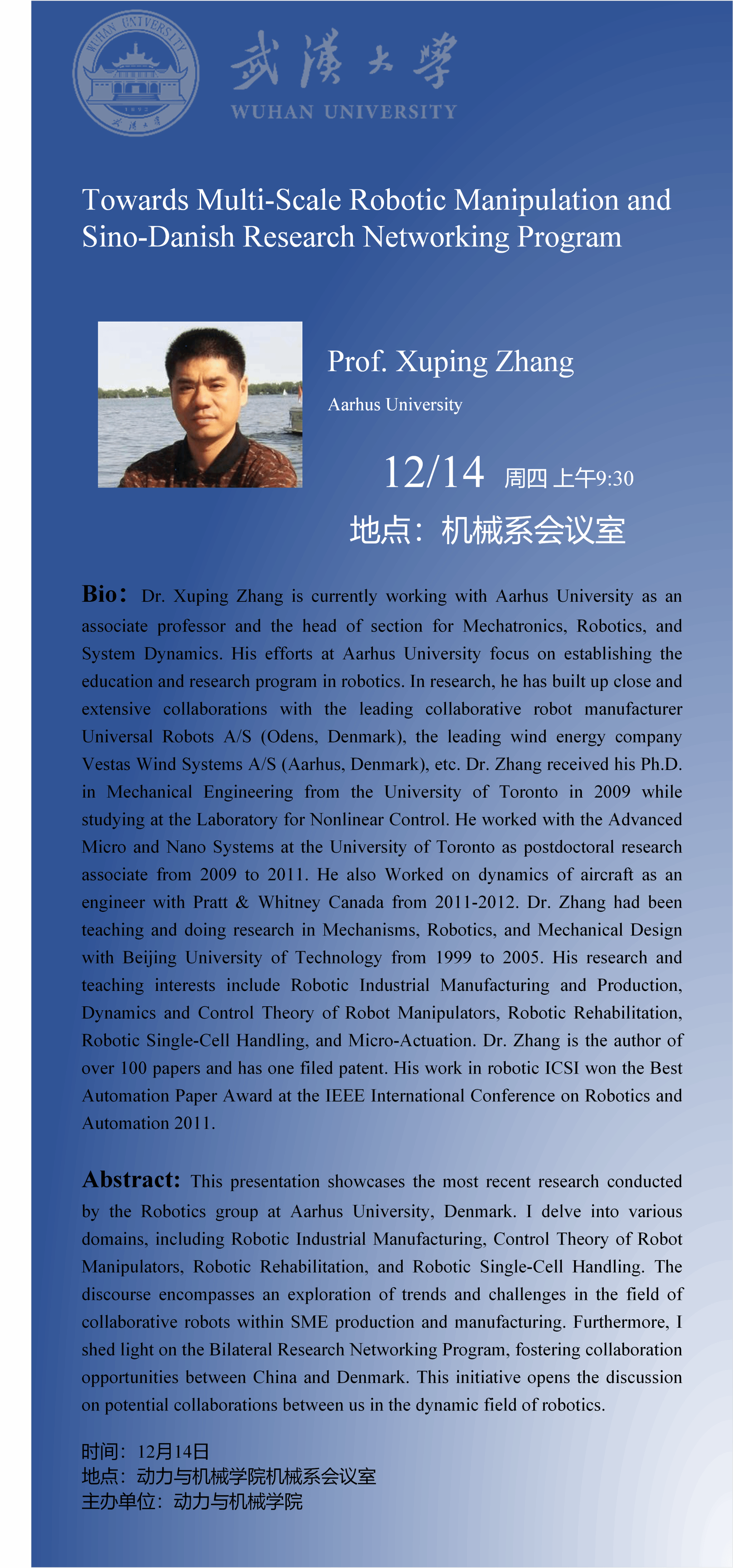 12月14日上午,丹麦奥胡斯大学(Aarhus University)Xuping Zhang教授受188金宝体育app下载 孙韵韵副研究员邀请进行学术报告。刘胜院长、巫世晶老师、王晓笋老师、马彦昭老师、郭朝老师、李登老师以及学院相关领域研究生参加讨论。Xuping Zhang教授目前是丹麦奥胡斯大学机械工程系机械一体化及动力学学科主任,承担丹麦创新基金和欧洲地平线2020等项目,主要从事机器人设计和控制研究,特别关注机器人应用在制造和生物工程等方面的挑战及解决方案。