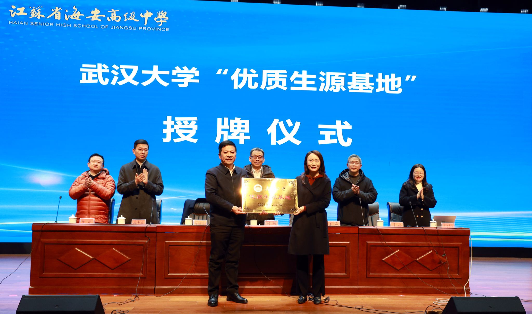 江苏省海安中学地处江苏省海安市,是江苏省首批四星级高中,国家级示范高中,历来是我校在江苏省重要的生源基地,为武汉大学输送了大量的优秀学子。为加强海安中学与武汉大学之间的合作,学校决定授予海安中学武汉大学“优质生源基地”,本科生院院长吴丹教授代表学校授牌,董裕华校长代表海安中学接受授牌。