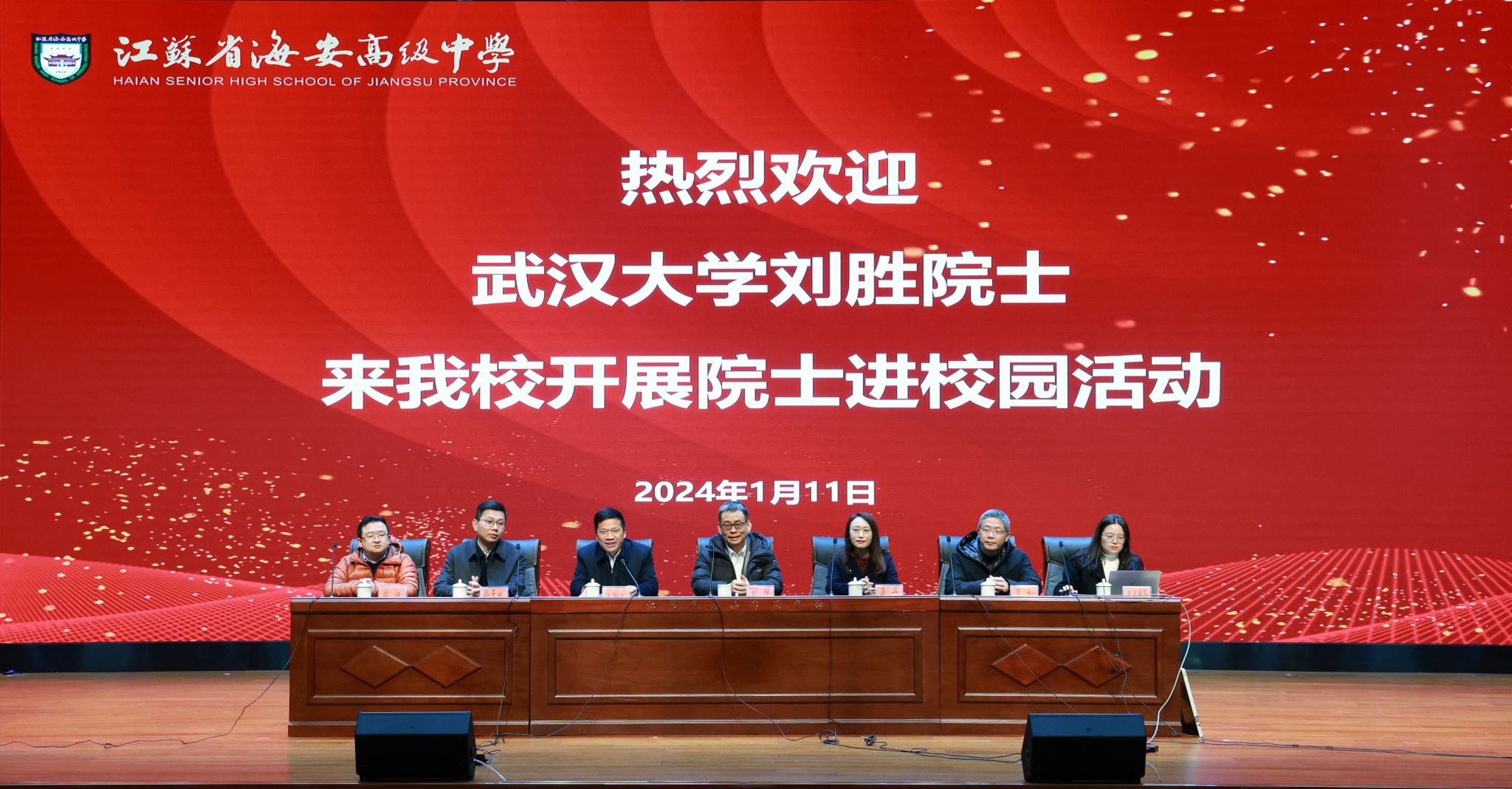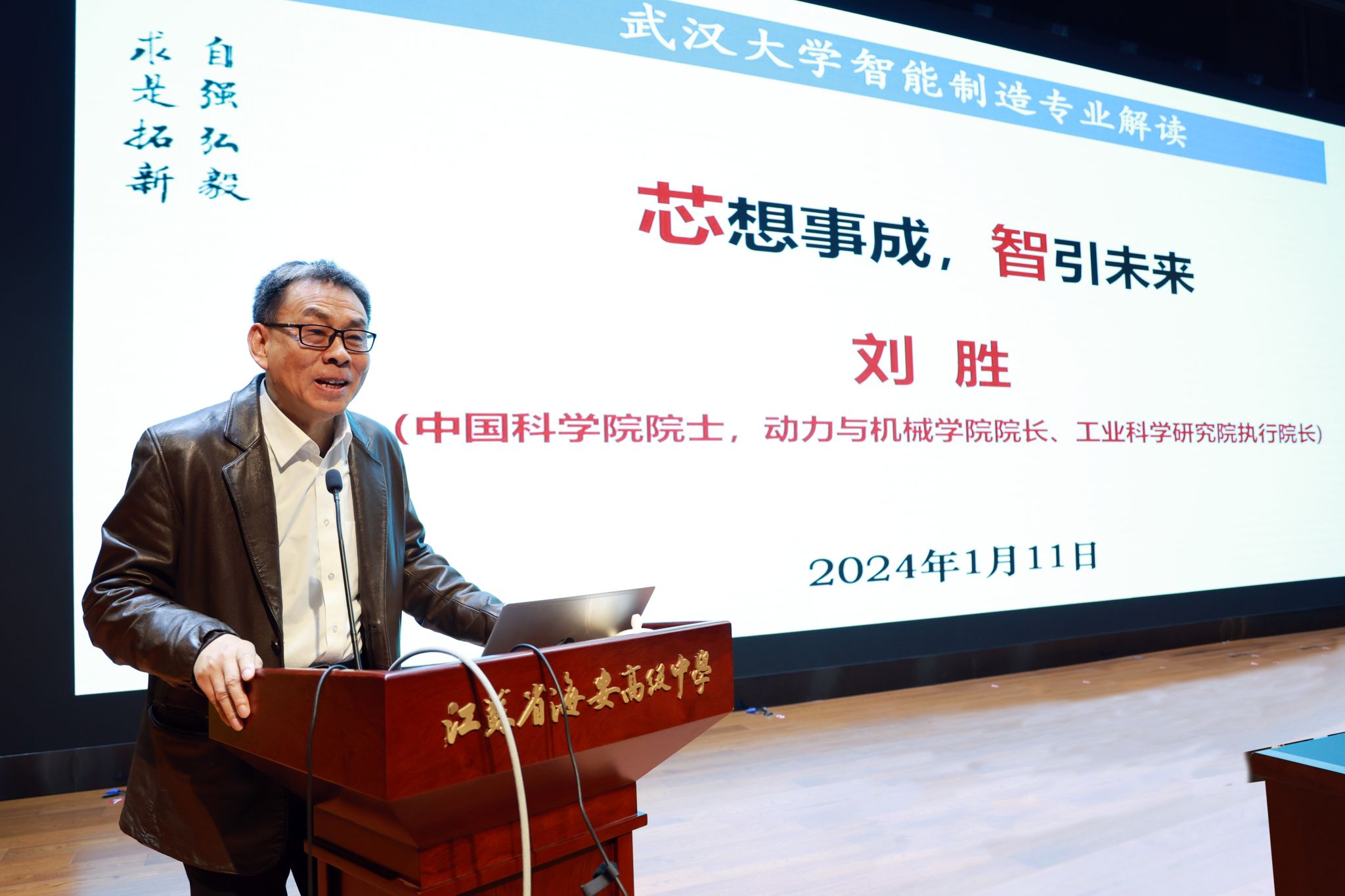 1月11日,我校赴江苏省海安中学举行武汉大学“优质生源基地”授牌仪式暨院士进校园活动。中国科学院院士、188金宝体育app下载 院长、工业科学研究院执行院长刘胜,武汉大学本科生院院长吴丹,188金宝体育app下载 党委副书记、江苏招生组组长匡松,武汉大学人才与专家办公室副主任徐干城,动力与机械学院党政办公室主任黄佳倩子,工业科学研究院综合办公室主任苗佳一行赴海安中学。海安中学党委书记、校长董裕华等领导师生参加活动。