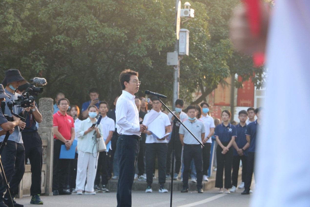 歌毕,武汉大学的教师代表土木建筑工程学院教授张晓平,学生代表水利水电学院学生李勇震先后上台发言。张晓平以《从全断面隧道掘进机到大国智造》为主题发言。他强调一个国家一定要将科技命脉牢牢握在自己手中,他结合时事和自己科研的心得向同学们表达自己对祖国的热爱和为之奉献的决心。李勇震表示作为新时代大学生,我们应该将自己的前途命运融入到国家的发展中,把青春献给党,为中华复兴付出自己的一份力。