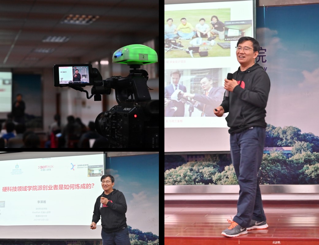 本网讯(通讯员:彭宇琦 编辑:刘泽庭 审核:胡耀武)12月13日晚7时,深圳科创学院发起人、XbotPark机器人部落创始人李泽湘教授携团队在学院学术报告厅举行“新智造时代——大学生能否做出影响世界的科技产品”主题讲座。动力与机械学院院长刘胜、武汉大学发展规划与学科建设办公室主任巫世晶、动力与机械学院兼职副院长胡耀武参与了本次讲座。讲座同时设置了腾讯会议,bilibili视频弹幕网,微信小程序视频号3个分会场同步进行线上直播,全校师生踊跃参加。