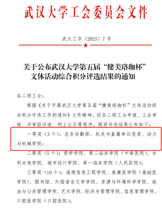 武汉大学第五届“健美珞珈杯”文体活动综合积分评选,学院工会凭借总积分全校第三的好成绩荣获一等奖。