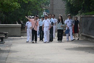 下午13:30,海工大动力工程学院谭波政委带领师生一行百人来到武汉大学牌坊,在动机学院师生的陪同下开始参观校园,大家参观了六一纪念亭、万林艺术博物馆、樱花大道、老图书馆,并沿着珞珈山环山路,走到周恩来旧居参观。一路上师生驻足聆听武大校史,深切感受百年学府的红色底蕴与人文积淀。海工大师生们身着整齐军装、身姿挺拔,如同一股刚健清新的风,为校园注入别样的青春活力与纪律之美。两种气质在珞珈山麓交融,绘就军地交流中别具一格的人文图景。