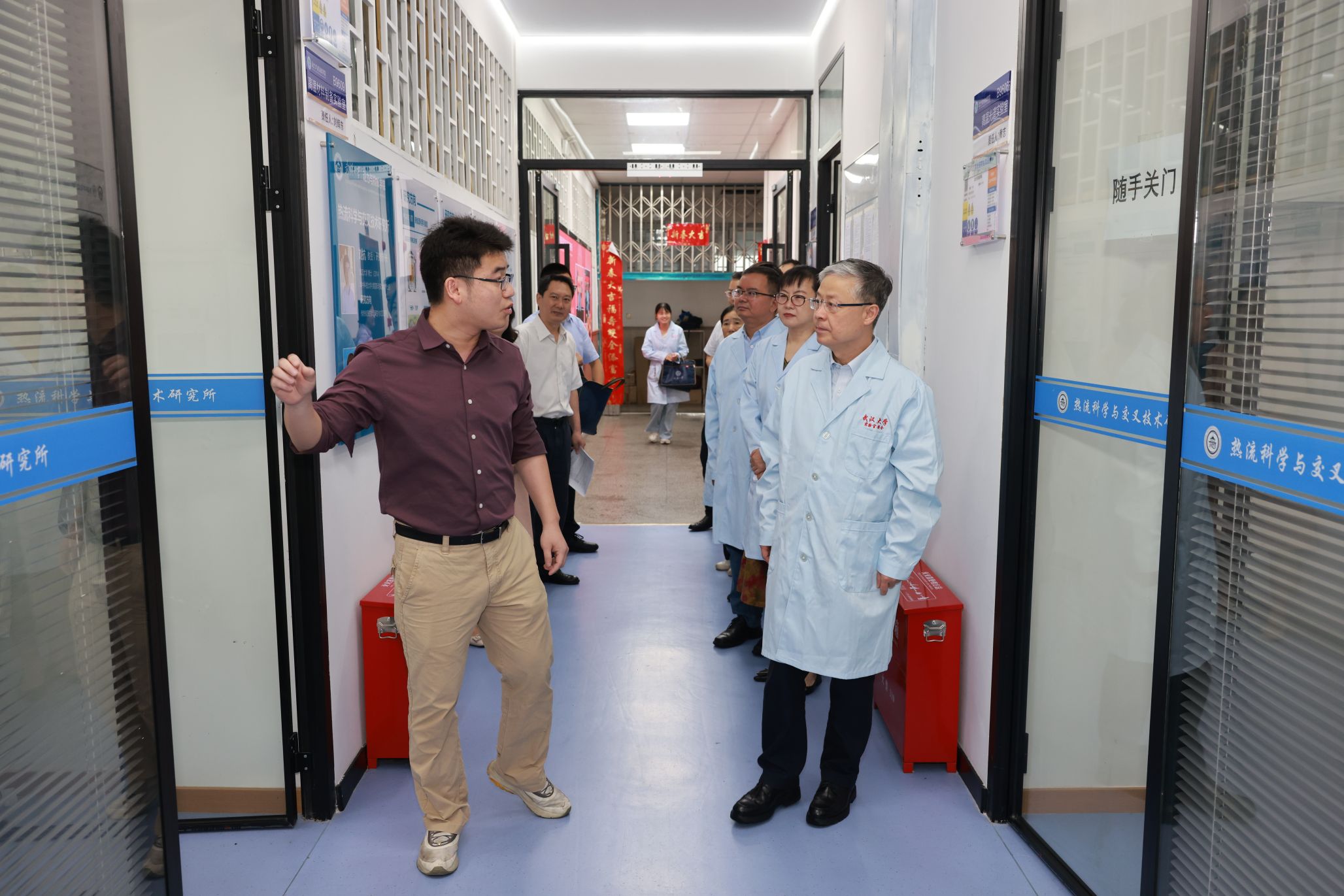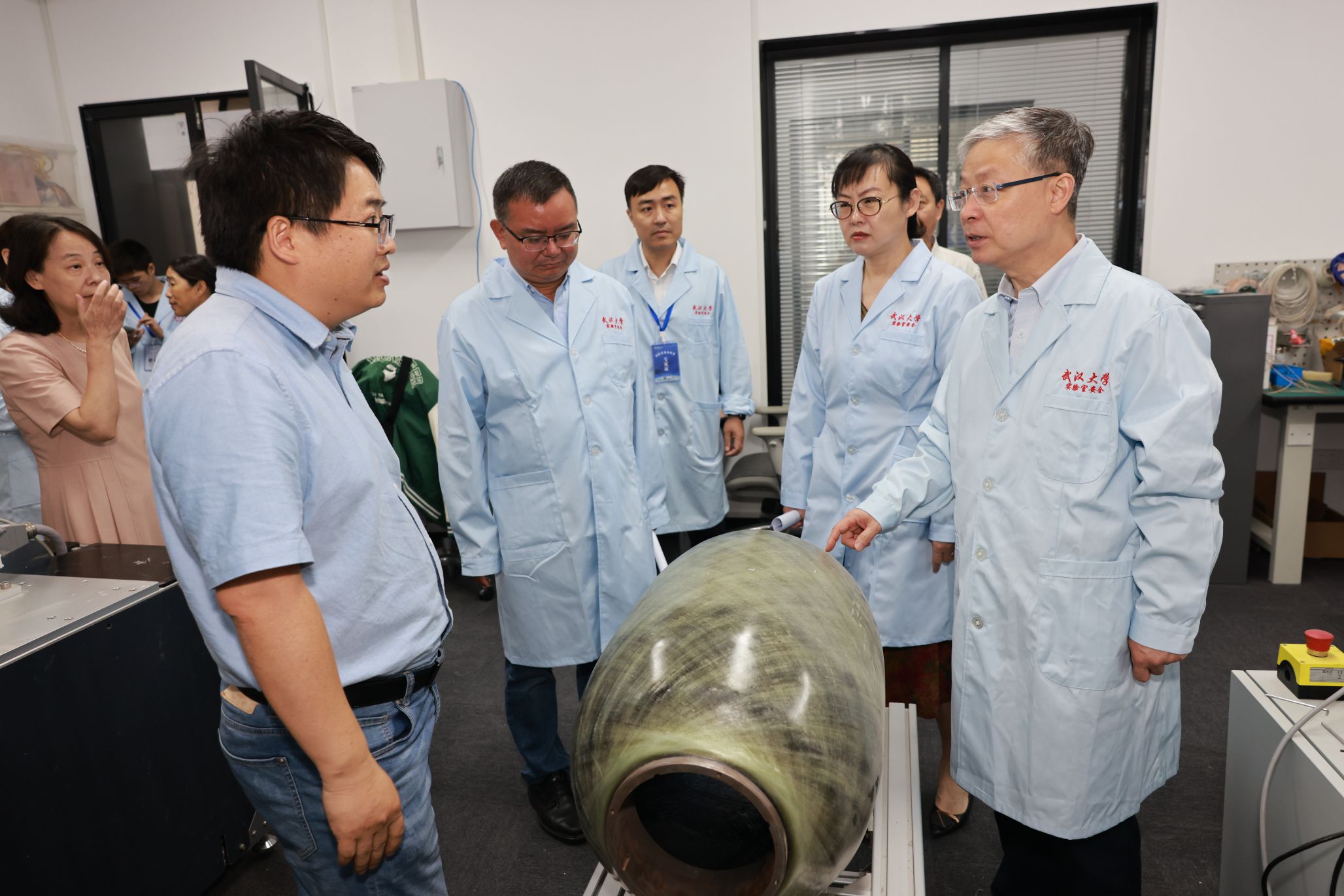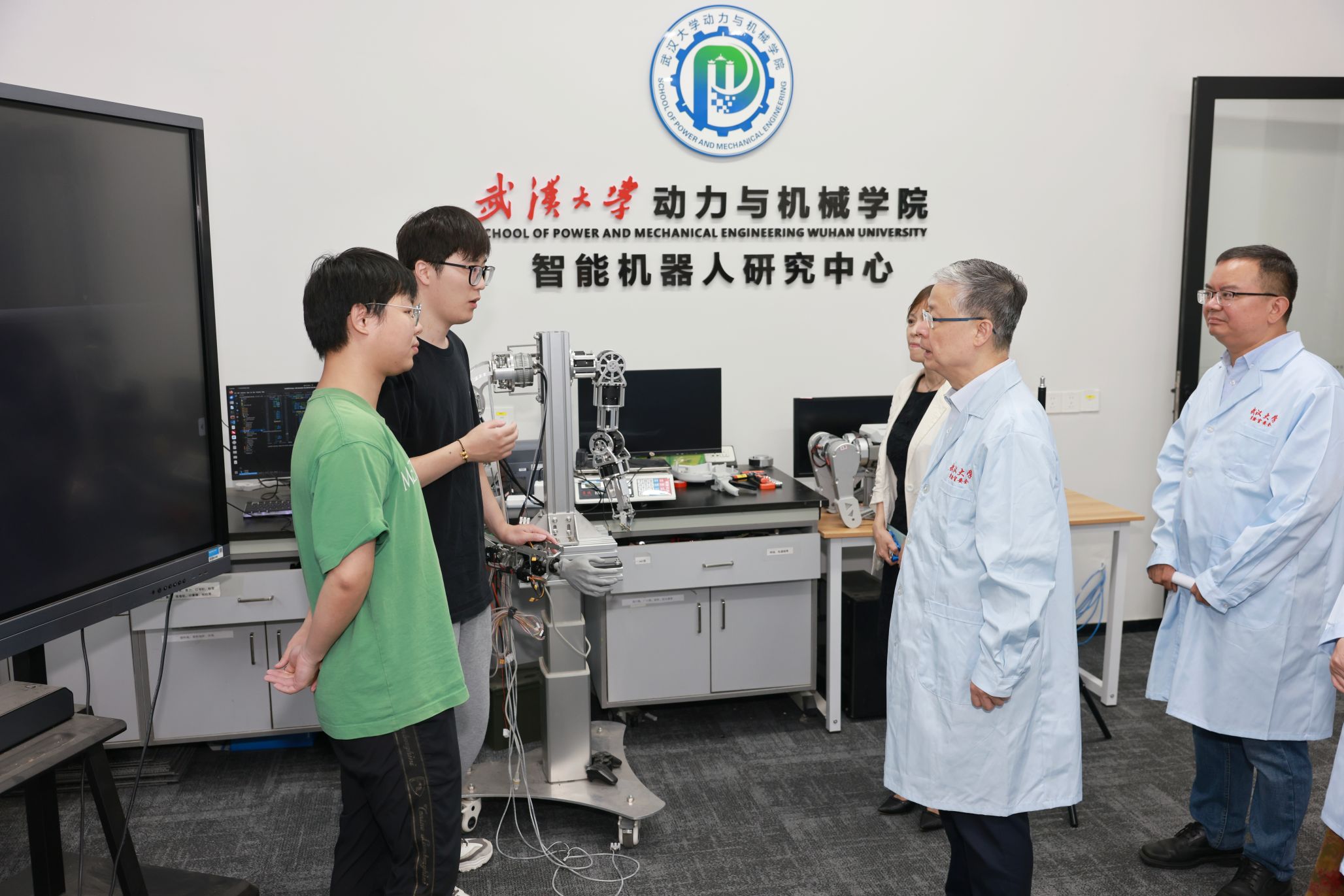 在智能机器人研究中心,黄泰岩与“天问”机器人团队师生亲切交流,听取了团队最新研发进展,充分肯定了团队在机器人工程领域做出的努力,鼓励团队就人形机器人的行动精密性和脚部动作仿生展开关键技术攻关。在青年人才杨婷的科研实验室,黄泰岩了解到她刚刚入职一年,对其实验室建设情况进行了详细了解,勉励其潜心科研,敢于创新,勇攀高峰。在实验教学中心,专家组听取了实验室与设备管理处张亮副处长介绍学院建成的全校第一个院级实验室智能安消一体化平台,检查了智能制造教学实验室和公牛实验室安全教育基地的安全运行状况。专家组还检查了成形制造研究所和学院集中供气气瓶间。