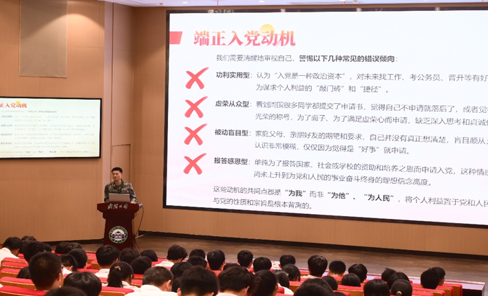2025级本科生辅导员文梓航为同学们详细介绍了大学生发展党员的具体流程和要求。他从申请入党的基本条件、入党申请书的撰写、培养考察过程、预备党员接收与转正等各个环节进行了清晰细致的说明,为有志于加入党组织的同学们指明了努力的方向和路径,激发了大家的政治热情。他强调,入党动机贵在纯粹,源于向往与贡献,而非随大流与谋便利。