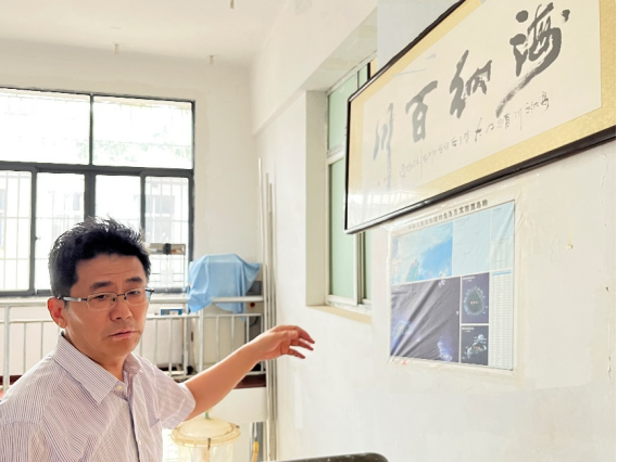 “这幅‘海纳百川’的字,底下贴着的地图是钓鱼岛。”叶教授说,“这是要学生拥有胸怀天下的气魄,和担当民族复兴的重任。”