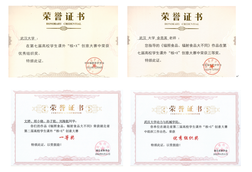 我院余亮英老师指导,文婷、胡小晓、孙子航、刘海航4位同学组成的辐照食品、辐射食品大不同创意团队表现突出,荣获高校学生课外“核+X”创意大赛湖北省一等奖、全国三等奖,武汉大学获得优秀组织奖。