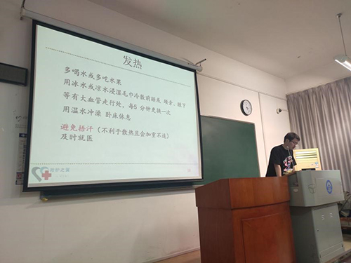救护之翼的讲师首先向我们详细讲解了出现溺水、触电等导致的休克事件的应对方式以及心肺复苏的操作步骤,使用医疗教学专用假人向我们展示了实际的操作过程,并邀请了多位同学亲自动手体验心肺复苏的操作。