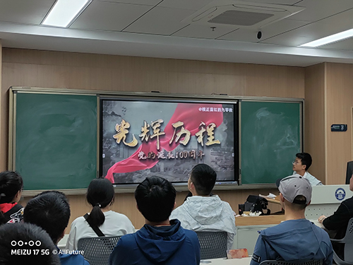 紧接着杨嘉璇带领团员们进入了活动的第二项内容:共学百年党史。首先,杨嘉璇带领大家收看了党史纪录短片《回望党史》。纪录片虽然时间不长却详细介绍了自1911年辛亥革命至1921年中国共产党诞生,再到1949年中华人民共和国成立,又一直到2020年中国战疫。影片中许许多多革命先辈、许许多多优秀青年可歌可泣的事迹深深的触动着每一位观影者的爱国爱党之心。随后杨嘉璇又对影片中的党史进行了总结:“中国共产党自成立后,可大致分为六个时期。
