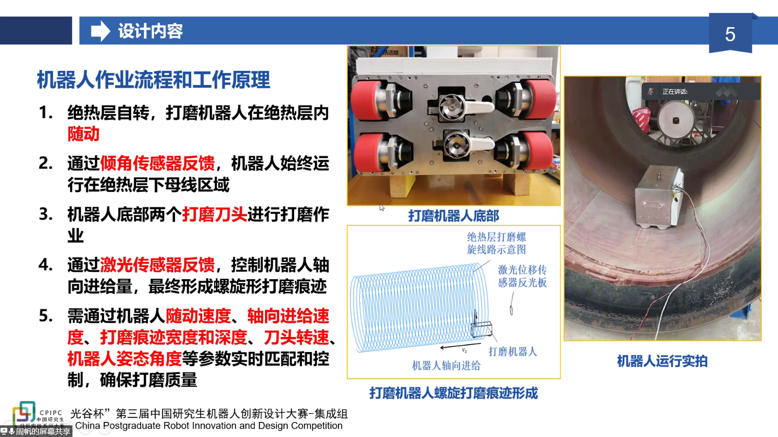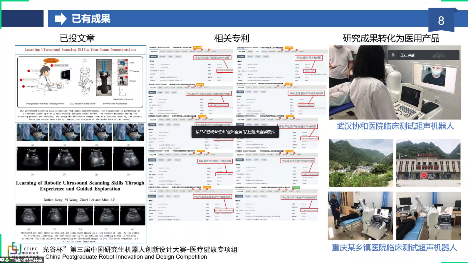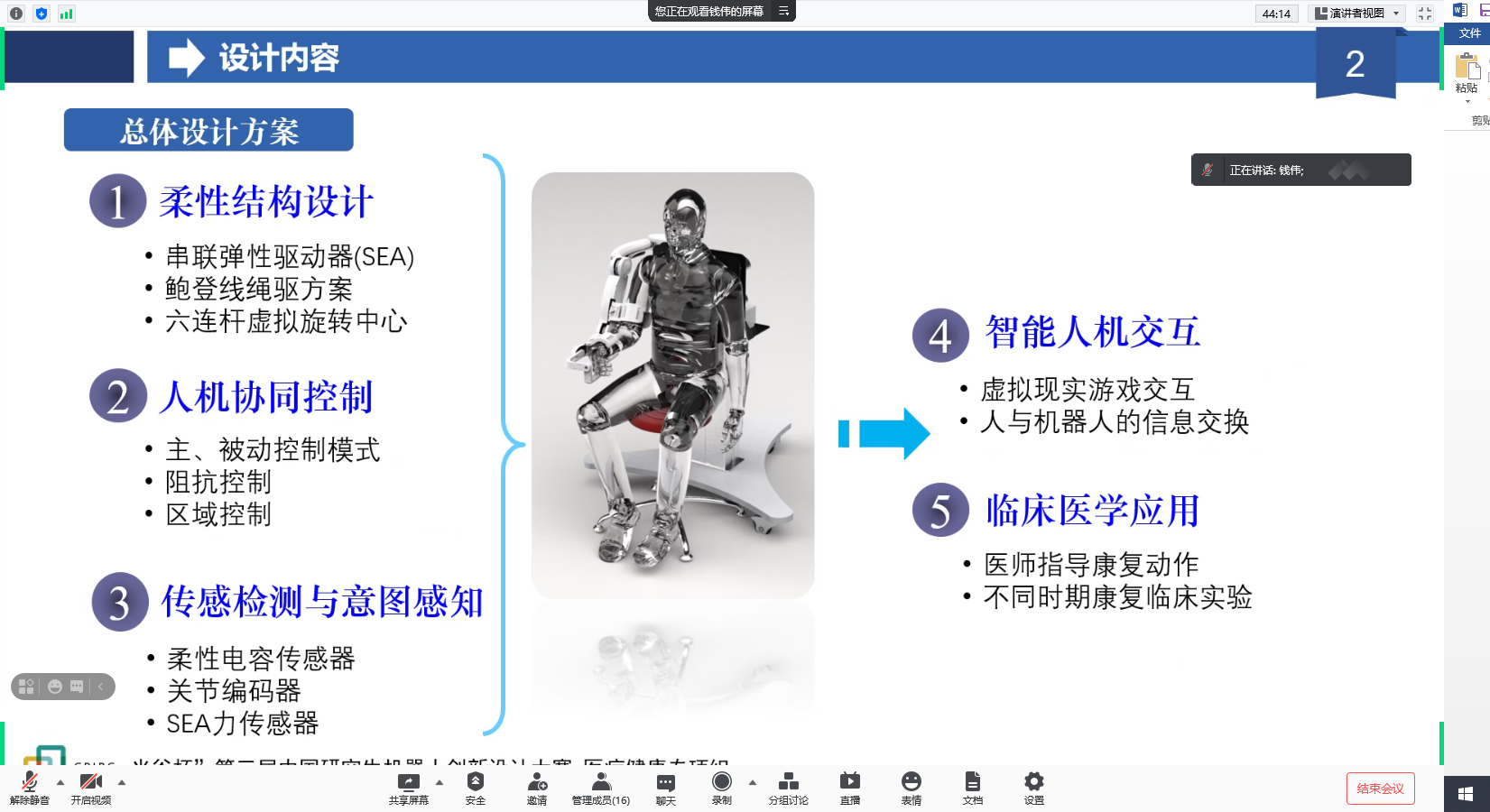 首先展示的是USbot队,展示了一种遥操作超声机器人系统,通过模仿医生操作习惯,设计仿形控制手柄,创造性地采用主动柔性和被动柔性结合的控制策略;第二支展示的是绳之右手队,展示了一种轻量化上肢柔性外骨骼机器人,采用了与人体运动相融的柔性结构与驱动方式,同时结合VR游戏开发了上肢康复训练系统;第三支队伍是凌晨三点饮茶队,展示了一种用于固体发动机绝热层的打磨机器人;第四支队伍是队长说的都队,展示了一种模块化水路两栖机器人,该机器人可在水、路两种条件下正常行以及复杂环境下仍能保证良好爬行能力的机器人。