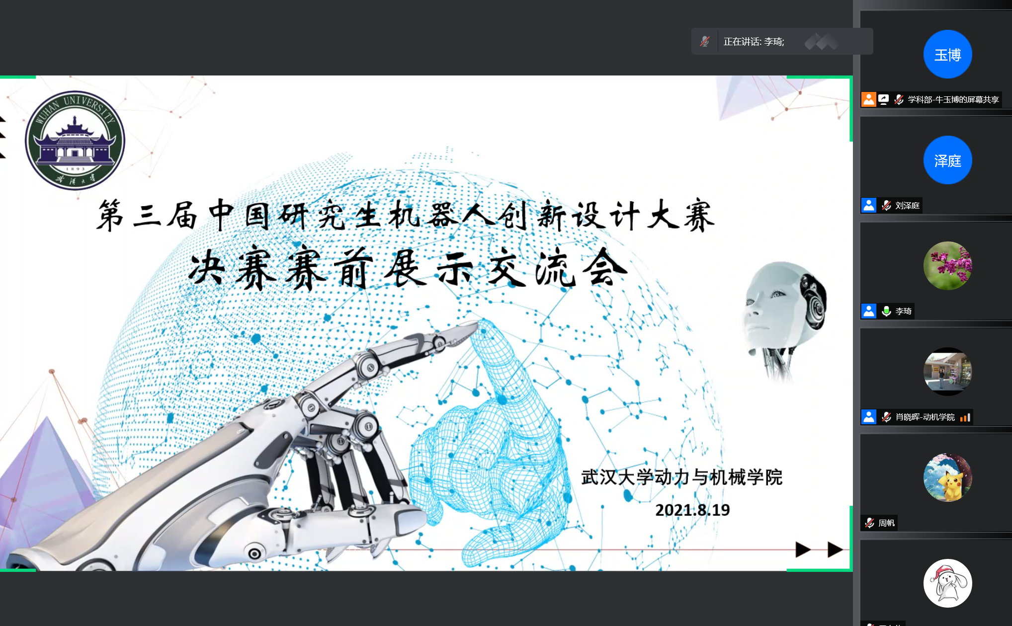 为帮助我校入围大赛总决赛的4支参赛队伍熟悉决赛规则和比赛流程、优化作品的展示形式和内容层次,我院作为该项赛事的牵头单位,于8月19号上午举办了学校第三届中国研究生机器人创新设计大赛决赛赛前展示交流会,本次交流会使用腾讯会议以线上形式进行。学院党委副书记李琦、副院长肖晓晖、研究生辅导员刘泽庭以及4支入围队伍队员参加了本次交流会。本次交流会由刘泽庭主持。