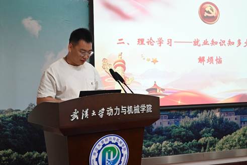 随后,周迪一以“就业知识知多少,支部帮忙解烦恼”为主题,分享了关于基层就业方面的经验案例。他详细介绍了选调信息渠道获取、基层就业政策等方面的情况,并对后续基层就业月的系列活动作出安排。他表示,各支部书记应通过主题党日活动将会议内容传达给每一位支部成员,引导我院学生了解基层、奉献基层,将个人理想追求有机融入党和国家事业发展。