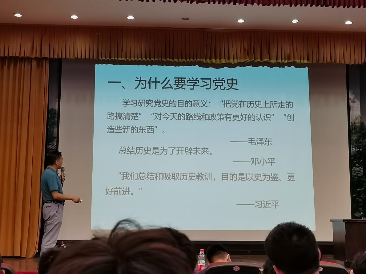 下午14时30分,在同学们热烈的掌声中,讲座正式开始。汪书记由湖北武汉的现代发展史切入,通过中美GDP的比较,分别从“为什么要学习党史”、“苦难行军的百年”、“几点学习体会”三方面向同学们详细介绍了中国共产党百年历史征程和中华民族伟大复兴历程。