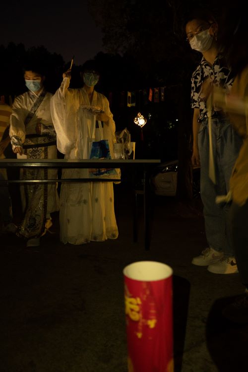 不到七点,凭借学生卡领月饼和集赞领取礼物的桌前就排起了长长的队伍,同学们对即将获得的精美礼品翘首以盼。此外还有一个个精致的灯笼等待着,它们将属于每一位穿汉服来场的同学。大家热情高涨,每一张灯谜前都围着认真思索的同学们。在欢呼声和惋惜声中,投壶活动也如火如荼地进行着。除此之外,也有许多积极的同学倾情献唱,在这个平常又特殊的夜晚留下了美好的旋律。活动最后,同学们纷纷凭借活动中得到的章兑换奖品,给本次活动画上完美的句号。