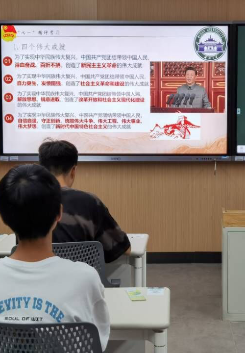 班长杨昊发言,表达了自己对青年、对社会、对国家的相关思考,体现了新时代青年深厚的爱国情怀。随后,同学们集体观看《觉醒年代》节选片段,革命先烈们的大无畏精神让同学们热血沸腾,激发同学们投身于无限革命事业的志向。