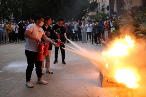 保卫部人员点起柴油火盆,亲自示范了如何使用干粉灭火器。同学们也在工作人员指导下有序体验了灭火的真实过程。正如汪书记所说,只有亲身体验一次使用灭火器灭火,在遇见真实的火灾时才能保持冷静,做到最大程度的自救。不少同学都是第一次参与消防演练以及使用灭火器,在切身体验后,他们纷纷表示从这次消防演练中获益匪浅。