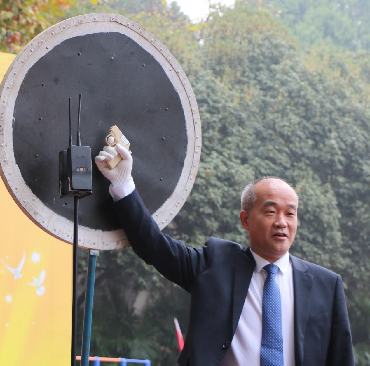 在飒飒秋风中,校长窦贤康打响运动会第一枪。