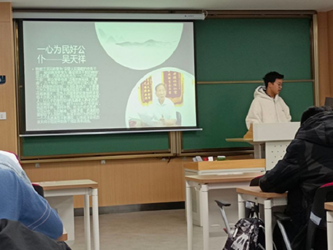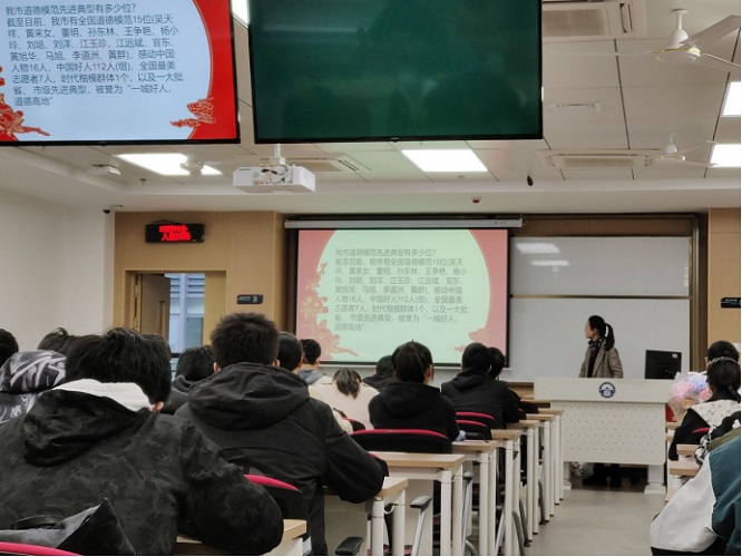 动力与机械学院工科试验班15、16、17三班联合举行了联合班会,张亦驰先介绍武汉市在创建文明城市的成绩,接着向同学们展示了全国道德模范以及武汉市获勋者事例,其中包括一心为民好公仆——吴天祥;孝女撑起一片天——黄来女;诚至纯的赤子之心——黄旭华。三位道德模范的事迹感动了在场同学,同学们思考起文明与个人、社会、国家的关系。本次班会在潜移默化中增强了同学们的责任心。