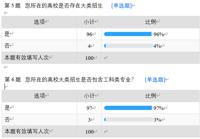 据100份线上问卷结果,所有目标高校均采用了“大类招生”模式。在这之中,多数高校的“大类招生”包含了工科专业。由此见得,“大类招生”的策略在42所高校中得到了普遍认可和采纳,这成为金宝搏官网入口 的重要环节之一。