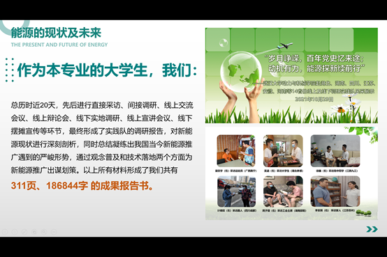 课程的最后,李安琪介绍了我国的“双碳”战略以及能源相关政策,让同学们进一步了解了我国为改善生态环境、寻求能源新发展所展现的大国担当。除此之外,她还为同学们简单展示了动力与机械学院团委以新能源为主题的暑期实践成果,让同学们看到了当代大学生的时代使命。