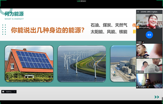 课程伊始,志愿者李安琪向同学们介绍了什么是能源以及能源的分类,让他们谈谈对身边所见能源的认识。