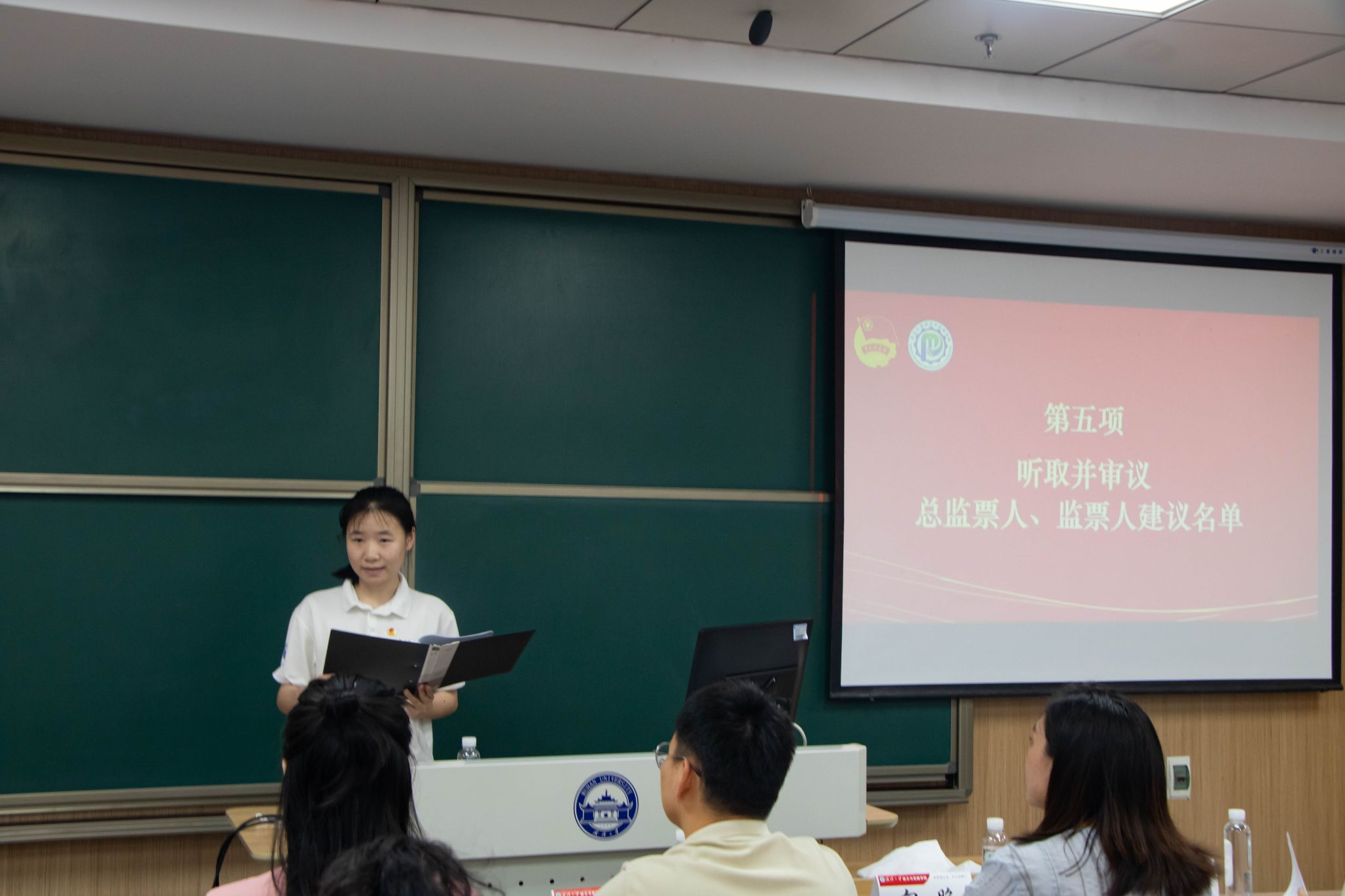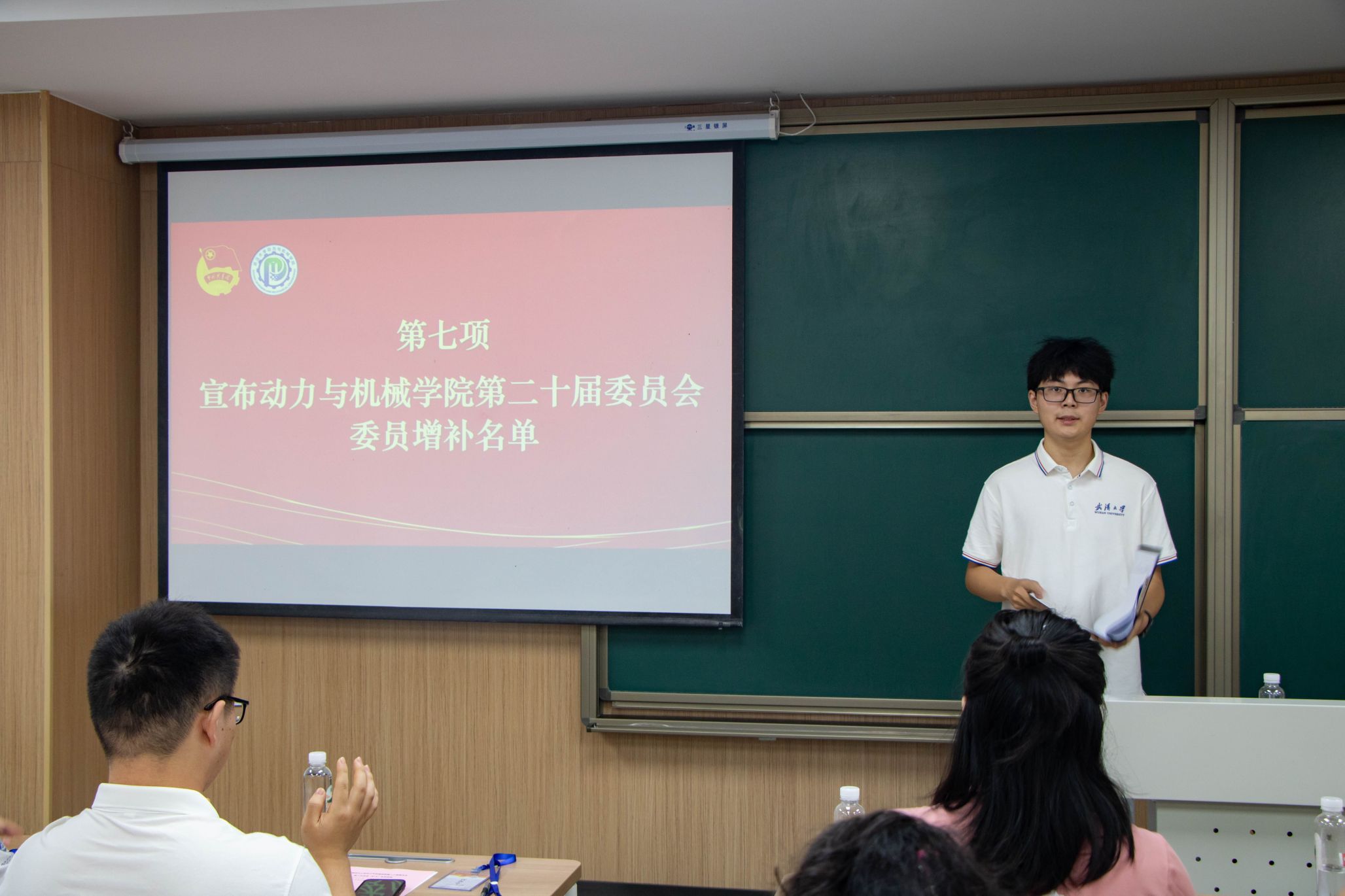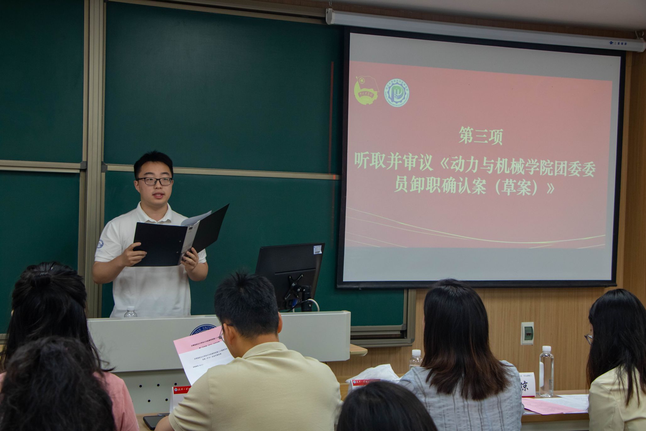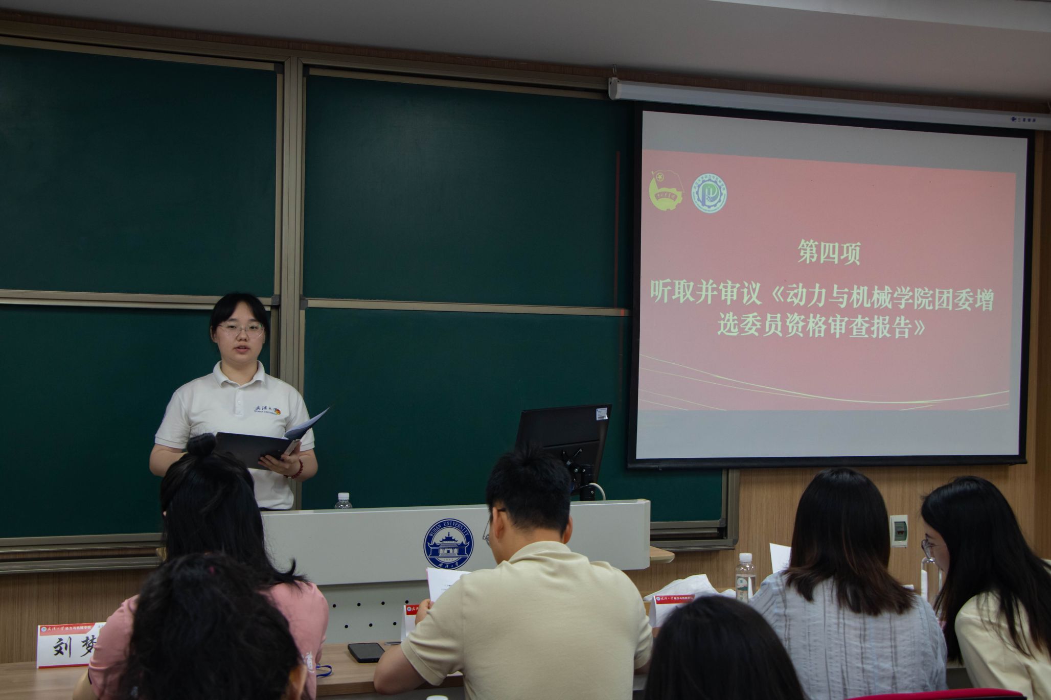 会议第四项,动力与机械学院学生团委副书记李熙瑜宣读了《动力与机械学院团委增选委员资格审查报告》。并简要介绍五位增选委员候选人:王桐新,万昊文,伍鑫宇,饶芝欣,杨建翊。