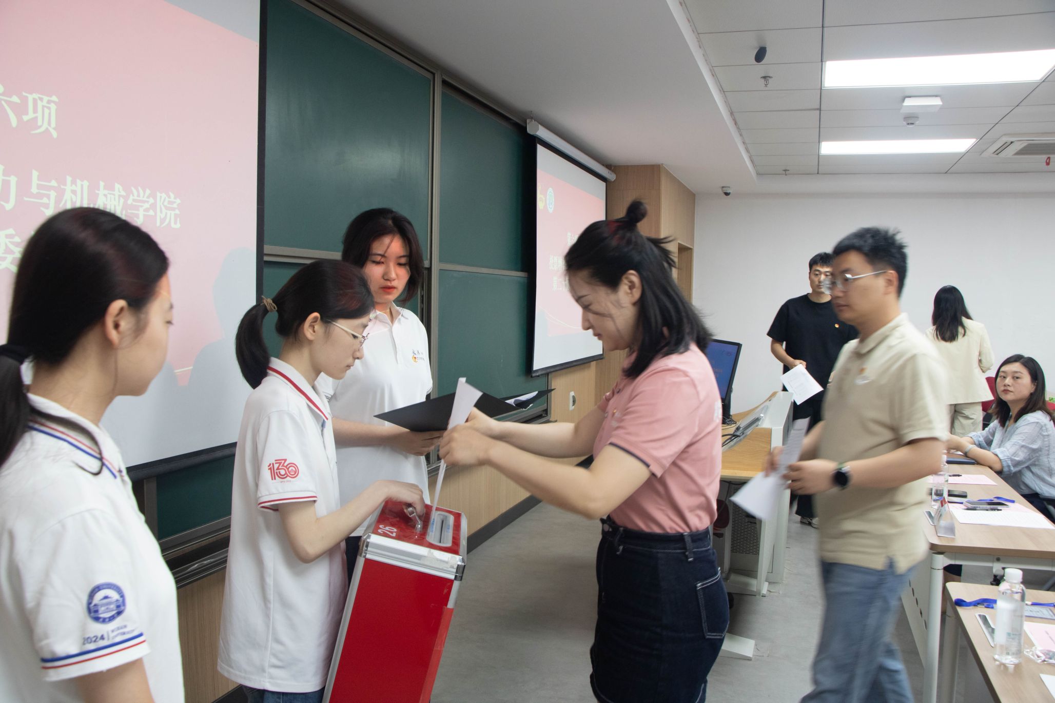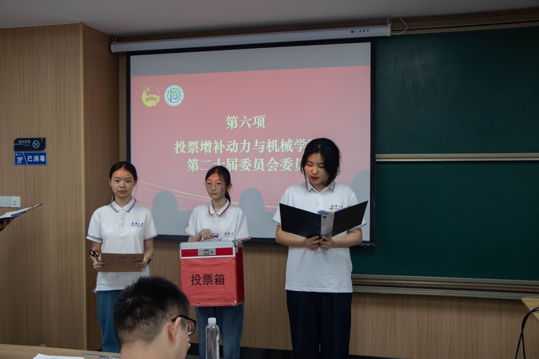 会议第五项,动力与机械学院学生团委副书记张宇彤宣读总监票人、监票人建议名单。并由总监票人黄紫晨负责投票环节并宣誓,主持人宣布投票规则,工作人员分发选票,与会代表对增补候选人进行投票,选举产生第二十届团委委员增补成员,经计票人严谨地统计票数后,主持人公布最终名单为:王桐新,万昊文,伍鑫宇,饶芝欣。