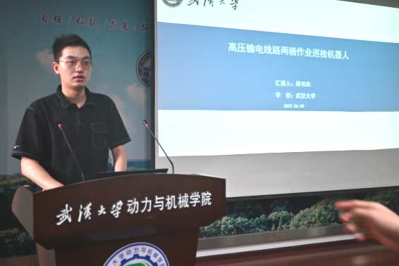 会上各位参赛队伍依次对作品进行了精彩的展示。首先是动力与机械学院的飞行者队(队长:周书杰)展示了一种用于对高压输电线路自主巡检的多旋翼无人机,其能够实现充电站自主起降以及导线识别与自主落线,利用图像识别分析线路中零件的损耗情况。