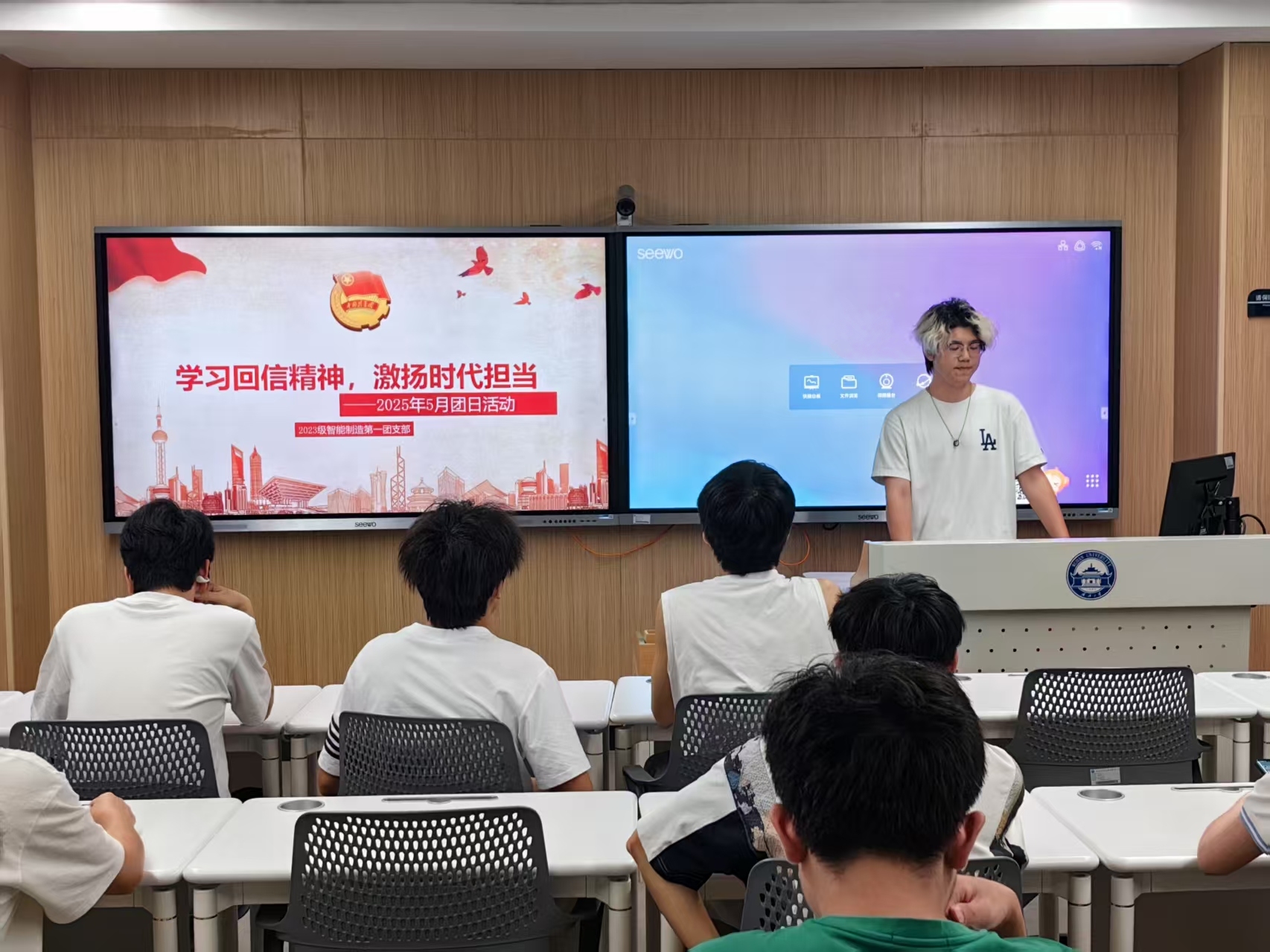 (文字记者:朱昊彤 图片记者:朱昊彤)2025年5月26日,188金宝体育app下载 2023级智能制造第一团支部全体团员青年于工学部A教学楼213教室开展“学习回信精神,激扬时代担当”主题团日活动。此次活动由团支部书记占子钦主持,旨在引领团员青年们深入学习习近平总书记重要回信精神,传承五四精神内核,激励团员青年们以青春之力投身中国式现代化建设。