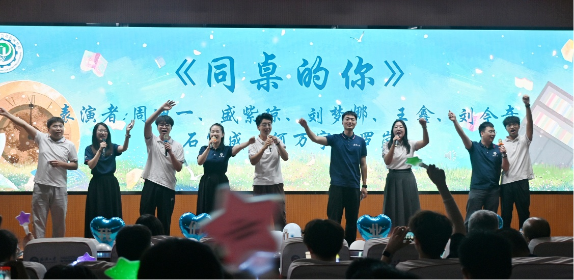 乘风织梦,拾光以成歌。精彩的抽奖环节过后,第二篇章在《同桌的你》的悠扬旋律中温情开启。辅导员老师与学子同台,将默默守护的陪伴化作歌声里的灯塔与春雨,照亮并滋养了逐梦的日夜。小品《史上第一大劫案》以机锋妙语掀起层层热浪。胡雯、黄德钊老师献上的《我们的歌》,王韬杰倾情演绎的《将故事写成我们》,如时光胶片,一帧帧回放着图书馆的灯火、课堂的专注与奔跑的身影。