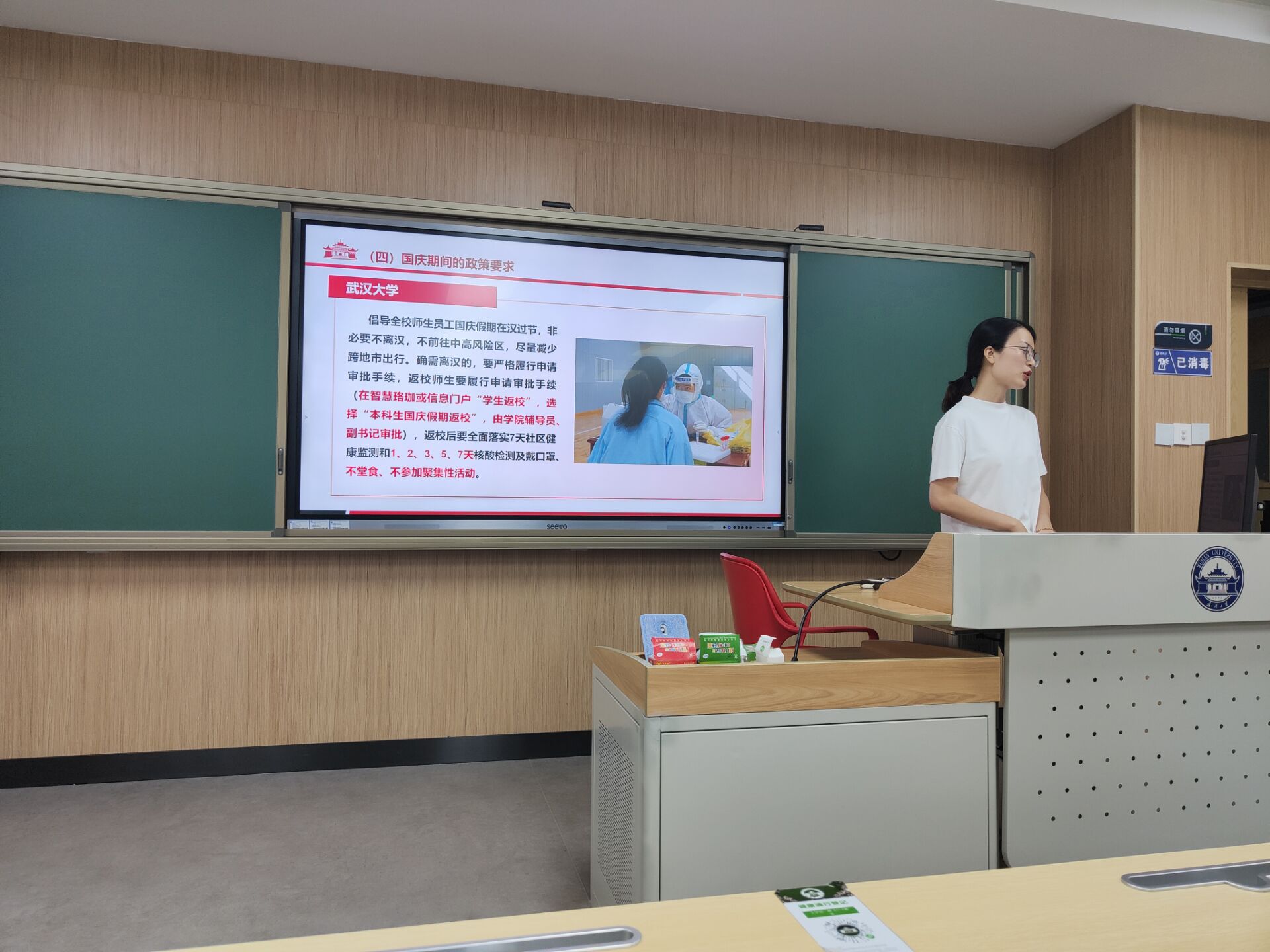 盛紫琼带领同学们学习了国庆节的安全事宜,强调了需要特别注意的事项,对同学们进行了相关知识的教育并解答了大家的一些疑惑。通过她的讲解,大家对于一些安全隐患有了更加深刻的认知。此外,她还对学校的政策进行了讲解,重点强调了疫情防控的相关要求,并希望大家可以积极配合学校的疫情防控工作。