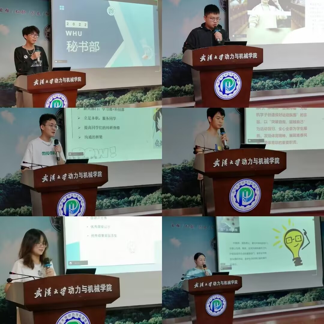 大会第五项:学生会各部门介绍,由部门代表分别介绍自己部门职责以及部门成员。作为学生会重要的幕后工作者、连接各部门的枢纽,秘书部率先登场,主要负责人关浚哲对秘书部进行了介绍。随后,外联部主要负责人刘娟总结:“外联部是主要以沟通,联系,交流为契机展开工作的部门,是学生活动得以顺利展开的基石”。组织开展学生体育活动的体育部也是学生会的重要部门,体育部未来学院学员叶行飞说道:“体育部一直秉持着‘为动机学子创造良好运动氛围’的宗旨,以‘突破自我、超越自己’为目标,全心全意为学生服务”,使大家更加明白体育部的工作精神。学创部主要负责人闫炯羽提出学创部是为我院打造良好学术氛围的主要部门,主要工作就是将学习与科创相结合。作为服务同学的学生会,学生权益的保障一定是必不可少的,权益部主要负责人李佳萌介绍了权益部的主要工作内容。在同学们忙碌的学习之余,自然少不了趣味无穷的文艺活动,文艺部主要负责人宋可列举了文艺部的主要活动:迎新晚会、中秋灯谜会等,展示出了文艺部的风采。在介绍完各个部门的职责后,成员们开始进行自我介绍,相互认识了解。