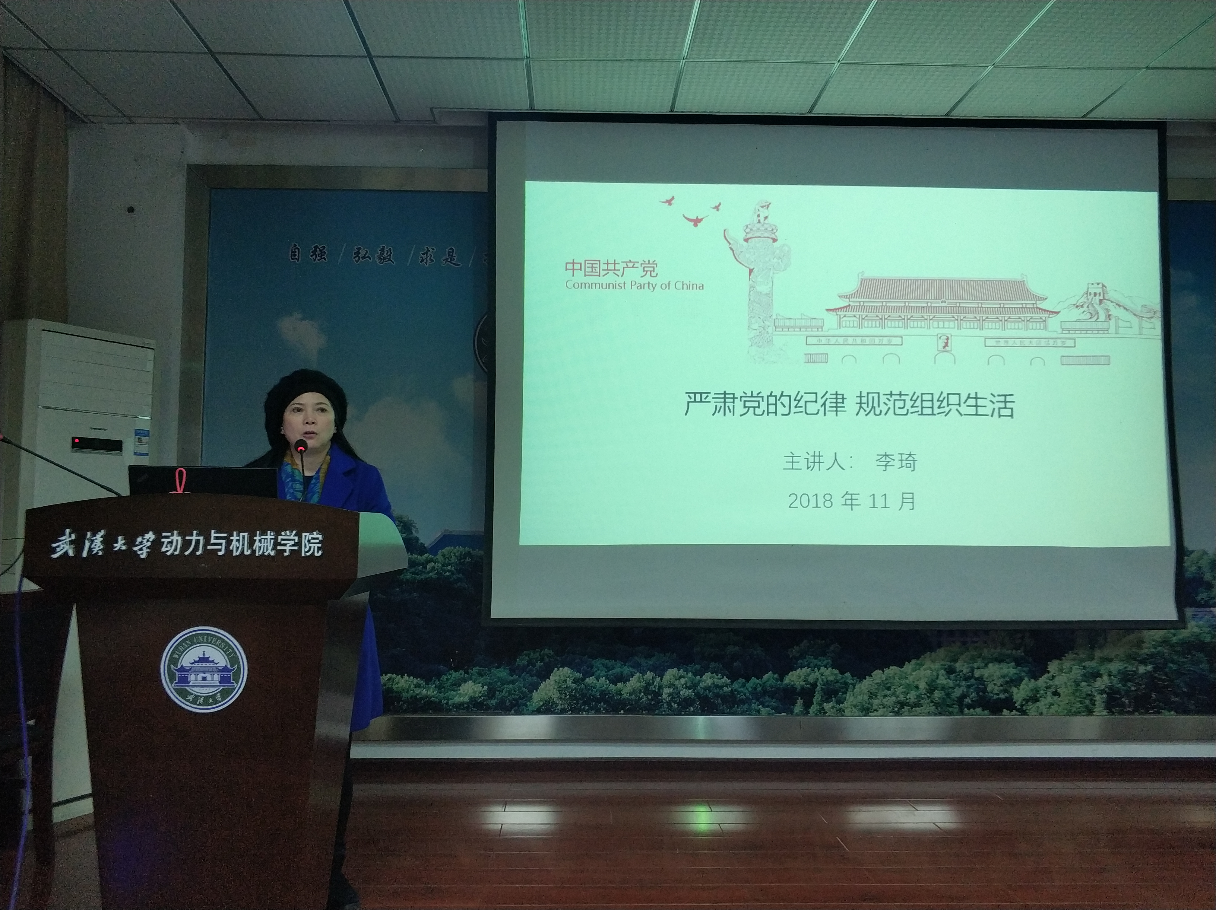 党课一开始,李琦首先强调,入党是一件严肃且神圣的事,每一名党员应该清楚了解党的一个章程、两个条例、两个准则,自觉承担责任,履行义务,努力成为一名优秀的共产党员,随后结合《中国共产党纪律处分条例》和《关于新形势下党内政治生活的若干准则》,对如何严肃党的纪律、规范组织生活展开了详细的讲解。