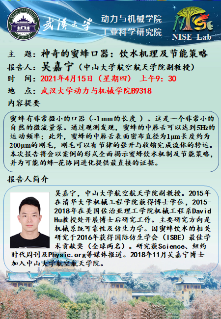 【讲座通知】神奇的蜜蜂口器:饮水机理及节能策略