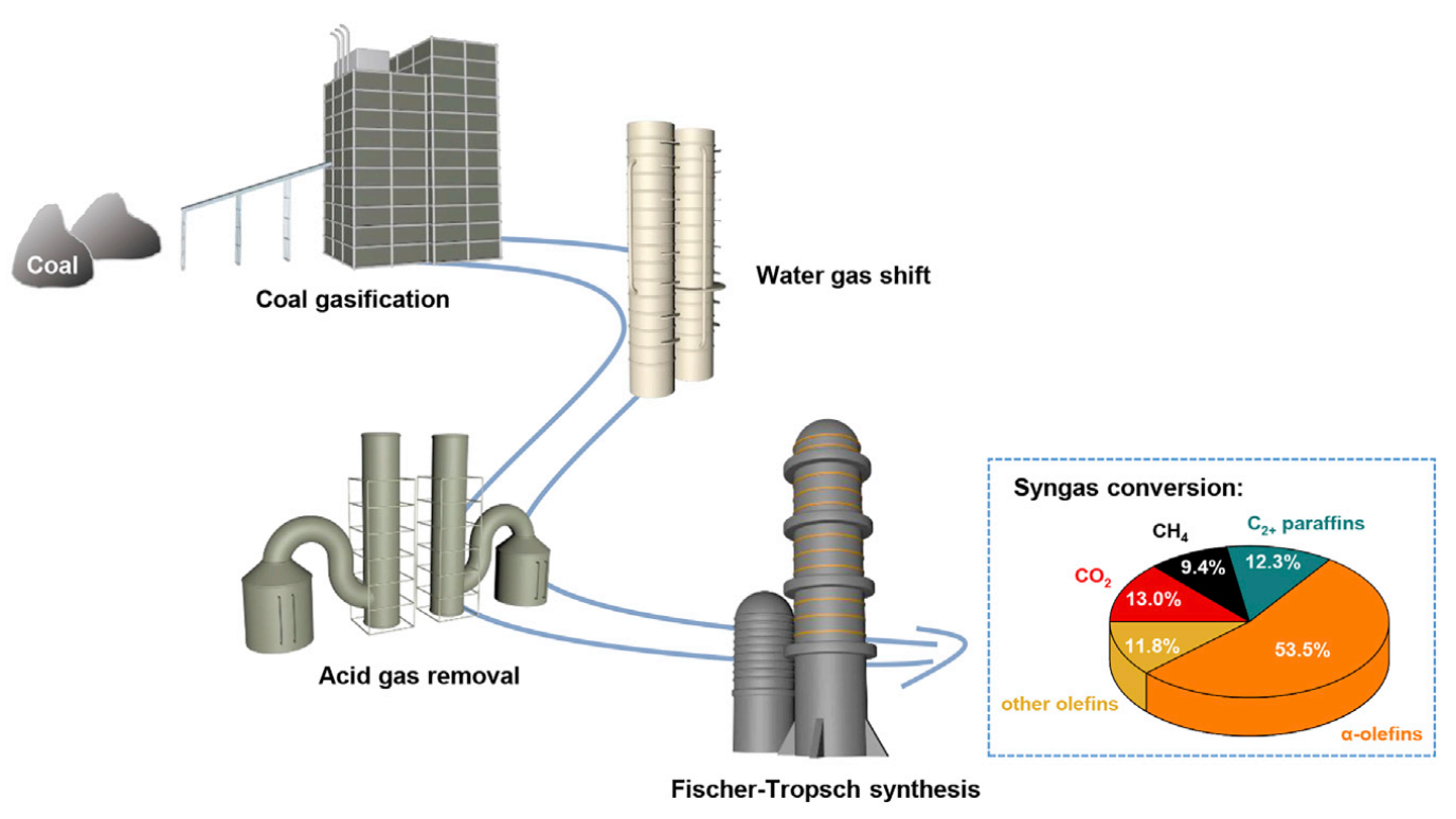 课题组前期工作(Science, 2021, 371, 610-613)中开发了一种新型疏水性FeMn@Si-c催化剂,在工业反应条件下(320 °C和 2-3 MPa),实现了合成气高选择性直接制取烯烃,二氧化碳和甲烷等C1副产物的选择性显著降低到23%以下,烯烃选择性可达65%,烯烃产率高达36%以上。