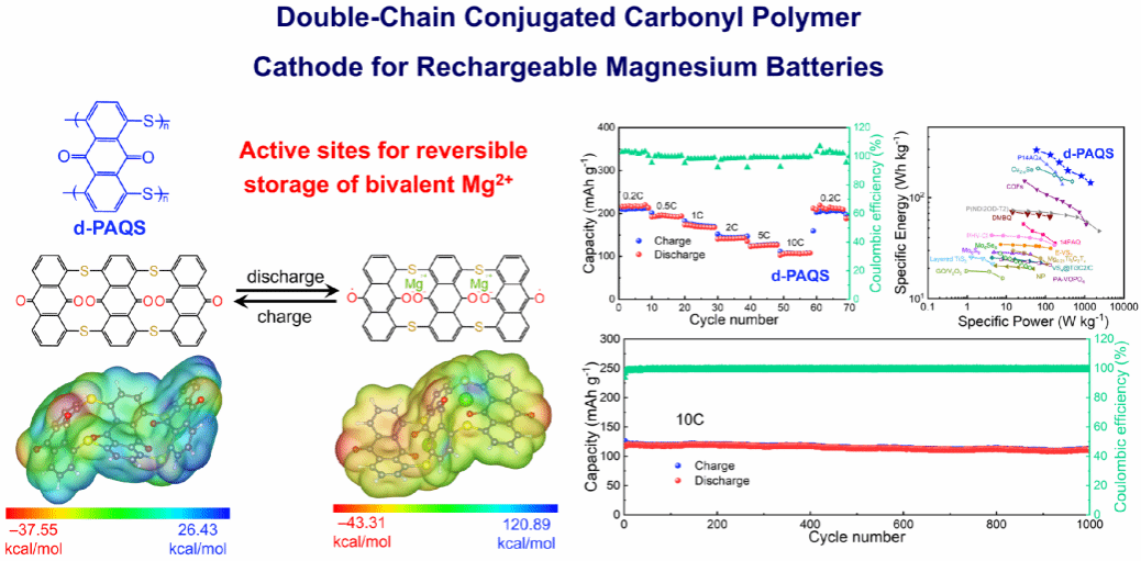 目前镁电池发展的最主要难点在于正极材料的开发,镁离子(0.72Å)与锂离子(0.76Å)半径相当,但带有两个单位正电荷,与正极材料作用力强,常见的无机正极材料储镁活性位点有限且动力学性能较差。针对此问题,徐飞副教授课题组设计了一类双链共轭羰基聚合物储镁正极。有机聚合物的柔性框架打破了无机晶格对镁离子嵌入的限制,该聚合物的双链结构利用空间位阻,使相邻的蒽醌单元向相反方向扭曲,固定了彼此指向的相邻羰基,构建了适合二价镁离子可逆存储的氧化还原位点。双链聚合物的大共轭结构缓解了充放电过程中的电荷密度变化,有利于镁离子的可逆缔合/解缔,从热力学和动力学上提高了储镁反应性能。本研究将有助于更科学地理解储镁反应特征和更合理地设计多价离子储存材料。