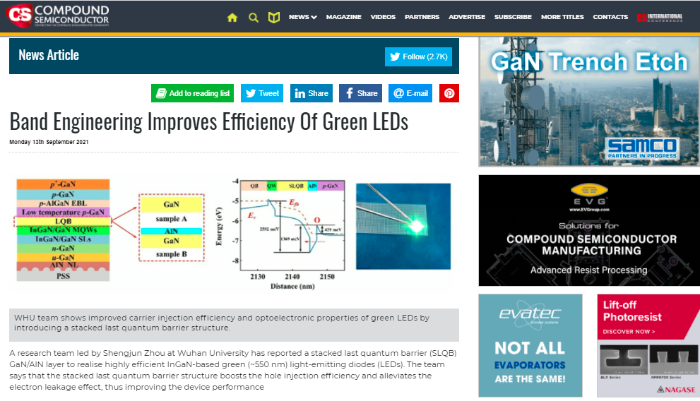 由于InGaN基LED具有可调发射光谱,对红、绿、蓝三色LED色彩混合是实现全彩Micro-LED显示的有效途径。为解决InGaN基绿光LED芯片外量子效率较低的问题,周圣军教授研究小组运用能带工程技术,重点研究了堆叠式GaN/AlN量子势垒对InGaN基绿光LED光电性能的影响。结果表明,在AlN/p-GaN界面产生的极化诱导面电荷可以加速空穴,并且GaN/AlN中的AlN层可以实现空穴的带内隧穿从而有利于空穴注入到有源区,同时也提高了电子的有效势垒高度。由于提高了空穴注入效率和抑制了电子泄漏,采用此结构的绿光LED发光效率得到显著提高,研究结果以《Stacked GaN/AlN last quantum barrier for high-efficiency InGaN-based green light-emitting diodes》为题发表在国际权威期刊《Optics Letters》。论文共同第一作者为陶国裔和赵晓宇,论文通讯作者为周圣军教授,武汉大学为论文第一作者和通讯作者单位。(原文链接:https://www.osapublishing.org/ol/fulltext.cfm?uri=ol-46-18-4593&id=458586)