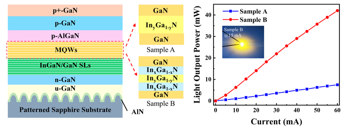 III族氮化物LED以其低能耗、长寿命和体积小等优点,逐渐成为传统光源的重要替代。一般来说,InGaN量子阱中铟(In)含量越高,LED发光波长越长。然而,随着铟组分的增加,InGaN量子阱面内压应力升高,会产生较强的极化场,导致InGaN基黄光LED量子效率仍然比蓝光LED低很多。周圣军教授研究小组扩展了能带工程在长波段LED中的应用,并分析了阶梯形量子阱对器件光电性能和晶体质量的影响。与方形量子阱 LED相比,具有阶梯形量子阱的黄光(〜570 nm)LED表现出更高的光输出功率及更优的晶体质量,研究结果以《Rational construction of staggered InGaN quantum wells for efficient yellow light-emitting diodes》为题发表在国际权威期刊《Applied Physics Letters》。论文第一作者为我院博士生赵晓宇,论文通讯作者为周圣军教授,武汉大学为论文第一作者和通讯作者单位。(原文链接:https://aip.scitation.org/doi/10.1063/5.0043240)