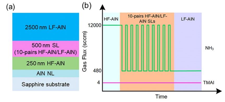 AlGaN基深紫外 (DUV) LED在杀菌消毒方面引起了广泛关注。外延生长在蓝宝石之上的AlN对紫外光透明并且具有价格优势,是目前应用最广泛的AlGaN基DUV LED衬底。然而,AlN和蓝宝石之间较大的晶格常数失配导致外延生长的AlN薄膜中存在高密度的位错,限制了AlGaN基DUV LED外量子效率的进一步提升。周圣军教授研究小组设计了一种交替V/III比的AlN超晶格结构,实现了较低生长温度(1180 摄氏度)下AlN薄膜的高质量外延生长。利用透射电子显微镜证明了交替V/III比的AlN超晶格结构可以引发穿透位错的倾斜,从而增加了穿透位错之间反应的几率,促进了位错的湮灭。此外,倾斜的位错还在平行于c面的方向上提供了失配位错的分量,从而促进了生长过程中张应变的释放,消除了开裂的风险。相关研究结果发表在国际权威期刊《Applied Physics Letters》,论文题目为《Strain management and AlN crystal quality improvement with an alternating V/III ratio AlN superlattice》。论文共同第一作者为唐斌、万泽洪和胡红坡,论文通讯作者为周圣军教授,武汉大学为论文第一作者和通讯作者单位。(原文链接:https://aip.scitation.org/doi/10.1063/5.0048656)