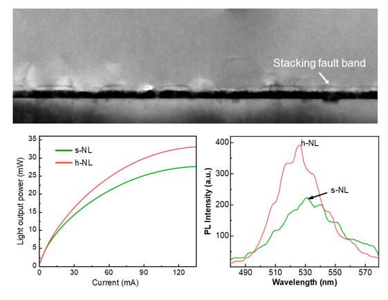 为进一步提高绿光LED效率,周圣军教授研究小组开发了由溅射AlN和中温GaN组成的复合成核层。在复合成核层之上继续外延生长GaN时,由于减小了GaN与蓝宝石之间的晶格常数适配,GaN倾向于横向生长,因此在GaN外延层中形成了层错结构。层错结构的产生有效的促进了应力的释放,减少了穿透位错的密度。此外,结合变温荧光光谱和时间分辨荧光光谱实验证明了生长在复合成核层之上的InGaN/GaN多量子阱中形成了更深的局域态,因此进一步提高了InGaN/GaN绿光LED的内量子效率。研究结果以《Toward efficient long-wavelength III-nitride emitters using a hybrid nucleation layer》为题发表在国际权威期刊《Optics Express》。论文共同第一作者为唐斌、宫丽艳和胡红坡,论文通讯作者为周圣军教授,武汉大学为论文第一作者和通讯作者单位。(原文链接:https://www.osapublishing.org/oe/fulltext.cfm?uri=oe-29-17-27404&id=456075)