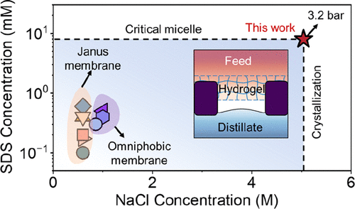 面对当前淡水短缺问题,海水和内陆微咸水淡化是重要的解决方案之一。膜蒸馏是一种热驱动分离过程,仅允许水分子通过微孔疏水滤膜,几乎可以完全排除水中的非挥发性溶质,有望实现高通量零液体排放。然而,高浓盐废水中的污染物在蒸发表面积累很容易导致滤膜润湿,进而造成结垢阻塞。刘抗教授团队发现水凝胶材料内部特殊孔隙使其具有高突破压力,特别是在表面活性剂存在的情况下,突破压力几乎不发生变化。通过在疏水性聚四氟乙烯膜上修饰水凝胶薄膜,可有效改善蒸发界面和超盐溶液中的滤膜润湿问题(图1)。在盐浓度为5 M和表面活性剂浓度为8 mM的溶液中,水凝胶复合膜表现出显著的稳定性,其突破压力达到20 bar,比商用疏水膜高出一到两个数量级。该研究通过分子动力学模拟揭示了水凝胶链网络与和表面活性剂之间的相互作用抑制表面活性剂的界面效应,减小后者在三相接触线处的聚集,并破坏表面活性物质在蒸发表面的有序分布,保护滤膜免于润湿。这些结果表明,水凝胶具有较强的水分束缚和防污性能,水凝胶复合膜在超咸水处理和零液体排放应用中具有广泛潜力。